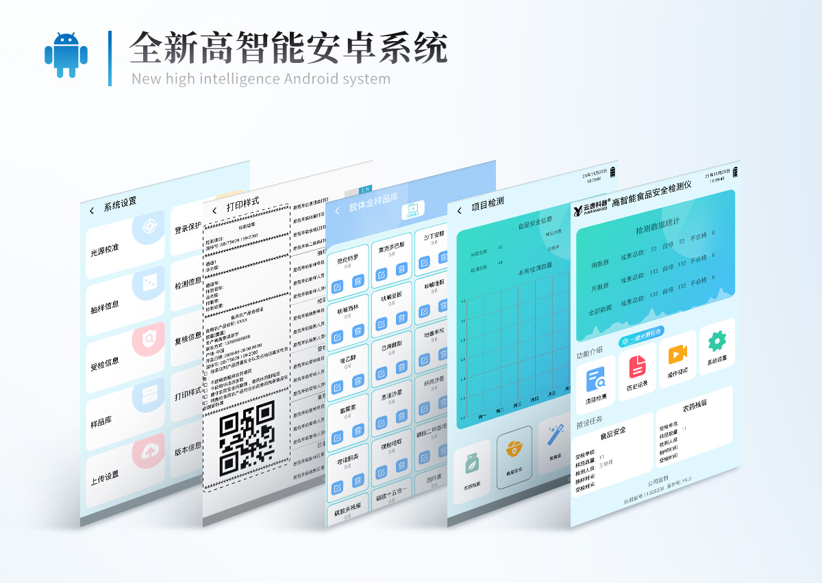 | 仪器采用手提式一体化系统检测技术,将分光光度模块、新型农残检测模块、数字化管理模块、无线通讯模块高度集成于一体,支持检测200种食品安全检测项目,同时预留升级检测方法。 | 仪器检测模块标准化、智能化,检测项目可随意自由组合。检测箱体内置多个标准检测单元,检测模块可以调整配置。 | 显示屏幕:仪器采用10.1英寸竖向液晶触摸屏显,搭配运行安卓智能操作系统,主控芯片采用ARM Cortex-A7,RK3288/4核处理器,主频1.88Ghz,操作方便,性能更强。 | 检测通道:≥12通道;采用精密旋转比色池设计,使用同芯片同光源校准精度,解决不同光源之间的误差值,更加准确**。(1-12通道间误差0.1%,***:**202022821055.2) | 仪器光源:高精度进口四波长冷光源,每个通道均配置 410、520、590、630nm 波长光源,标配**的光路切换装置,专利光路切换功能可实现64波长,并且所有检测项目可实现所有通道同时检测。 | 设备可一键校准,自动保存校准数据,自动对比校验,得到精准光源,采用Android SP存储数据,光源数据永不丢失,方便每一次使用。 | 通讯接口:配备无线通信模块、4G(APN)通讯模块、蓝牙传输,同时具有双USB接口以及RJ45网线接口,可以多方式实现数据保存及数据传输 | 存储方式:支持U盘存储,标准USB接口,免驱动安装。检测结果存储容量20万条以上,可生成Excel表格进行拷贝,并具有登录保护功能。 | 智能化操作系统: | 1)操作系统:仪器可在同一检测界面自动对应相关检测通道,一次性选择1-12个样品名称,无需退出界面,节省操作时间。并可以对每个通道属性和样品信息单独进行编辑,例如送检单位、人员,检测人员等,打印时勾选打印显示。 | 2)数据集成系统:设备首页自动汇总分析检测数据,包含:周检测数据、月检测数据,全部检测总数量,均包含检测总数,合格数,不合格数,以及相关柱形分析图,各项检测数据一目了然,无需电脑查询,更加快捷直观。 | 3)数据库系统:十几项数据库分类管理仪器:包含项目类型、项目数据、检测数据、历史记录、国标信息、曲线信息、采样信息、检测信息、受检信息、复核信息、图表信息、光源校准信息、打印样式信息、样品库信息等等,数据库之间互相协调联动保证数据的真实完整性。同时产品数据库以及历史检测记录支持一键检索功能。 | 4)限量规判系统:具有限量查询、添加物质合规判定系统。检测出结果后,系统自动调用系统数据库中相关国标进行比对判定,客观显示判定结果是否合格。 | 5)项目预设系统:仪器具有任务预设模块,一键提前预设,给出方便快捷的新检测方案,每一个任务分别可以设置不同的样品、批次、编号、来源、备注、抽样信息、检测信息、受检信息、复核信息等更多信息。样品送检时一键调取保存信息,并可多次调取,大大提高检测效率。 | 6)数据监管系统:同步对接监管平台,数据可局域网和互联网数据上传,检测结果可选择直接传至食品安全监管平台。进行区域食品安全监管及大数据分析处理与数据统计,检测区域食品安全长短期动态,达到食品安全问题预估、预警。 | 7)打印系统:内置全新打印机,新创自定义打印方式,可按需灵活勾选控制:产品合格证(国家农业部标准要求),二维码,抽样信息、检测信息,受检信息、复核信息、抽样日期、检测日期等信息的打印。 | 供电模式:仪器交直流两用,直流12V供电,可连接车载电源,可配6ah大容量充电锂电池,电量可实时显示,方便户外流动测试。 | 胶体金检测模块:采用双通道CMOS成像处理技术及胶体金免疫层析技术,可同时读取双胶体金卡数据,自动采集、处理分析,将检测结果显示,并可根据参考限值自动判断检测结果,可检测常见的兽药残留、生物毒素、抗生素、违禁添加物等。 | 1)探测技术:CMOS成像探测; | 2)检测通道:1个通道; | 3)检测方式:消线法和比色法; | 4)显示模式:阴性或阳性; | 5)曲线形式:轨道式扫描方式,显示金标卡图像,实时生成、识别CT曲线图,无需手动调整,完成检测后自动退出检测卡。兼容市场上其他金标卡,使用耗材不受限制。 | 仪器加入远程升级功能,可定向分客户分仪器更新,开机后自动更新,客户无需任何操作,即可升级全新项目。做到了无需退换机器即可实现实时远程升级检测仪器。 |