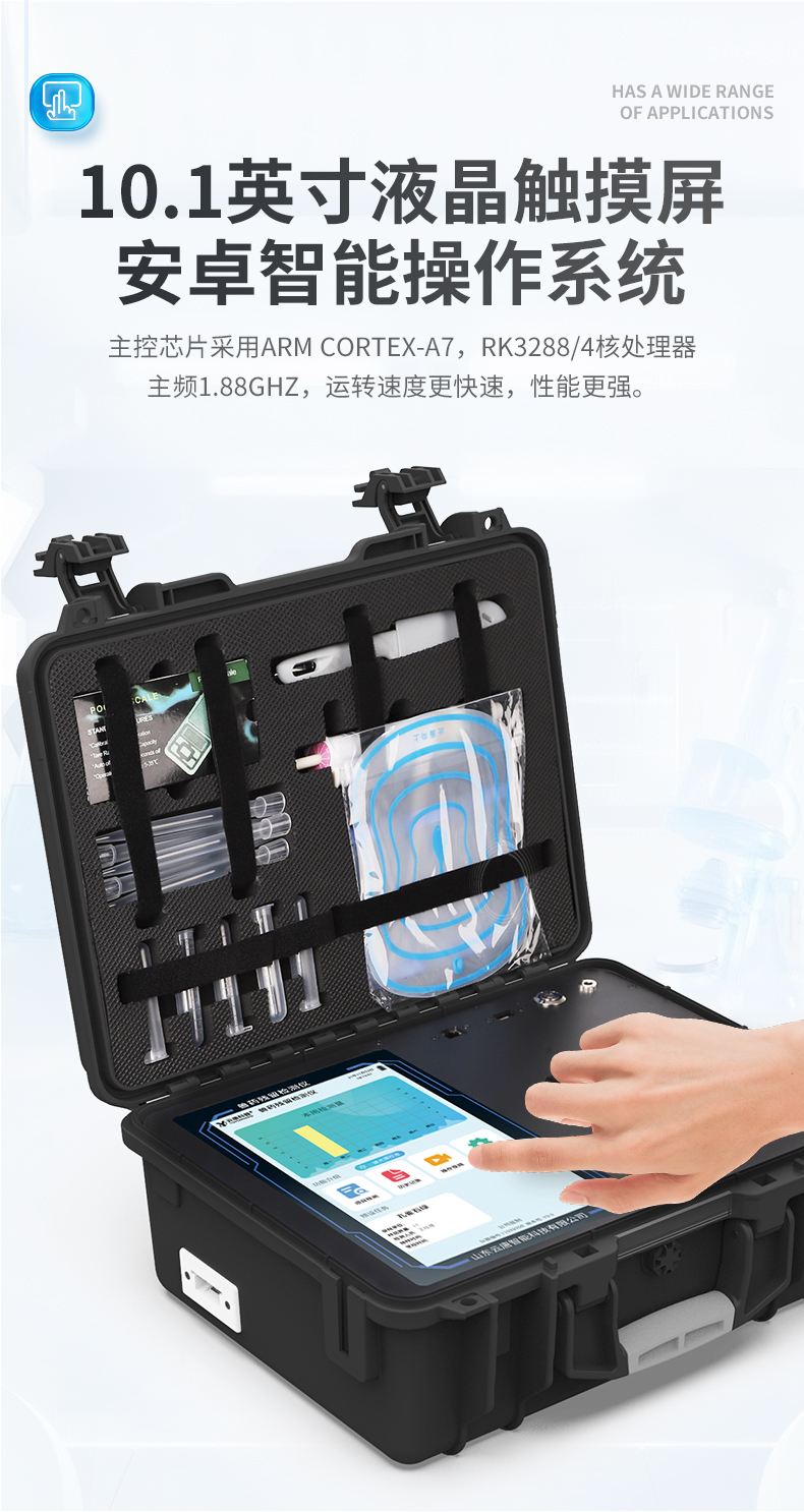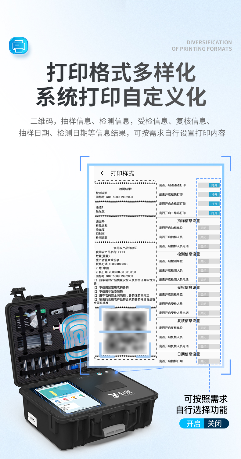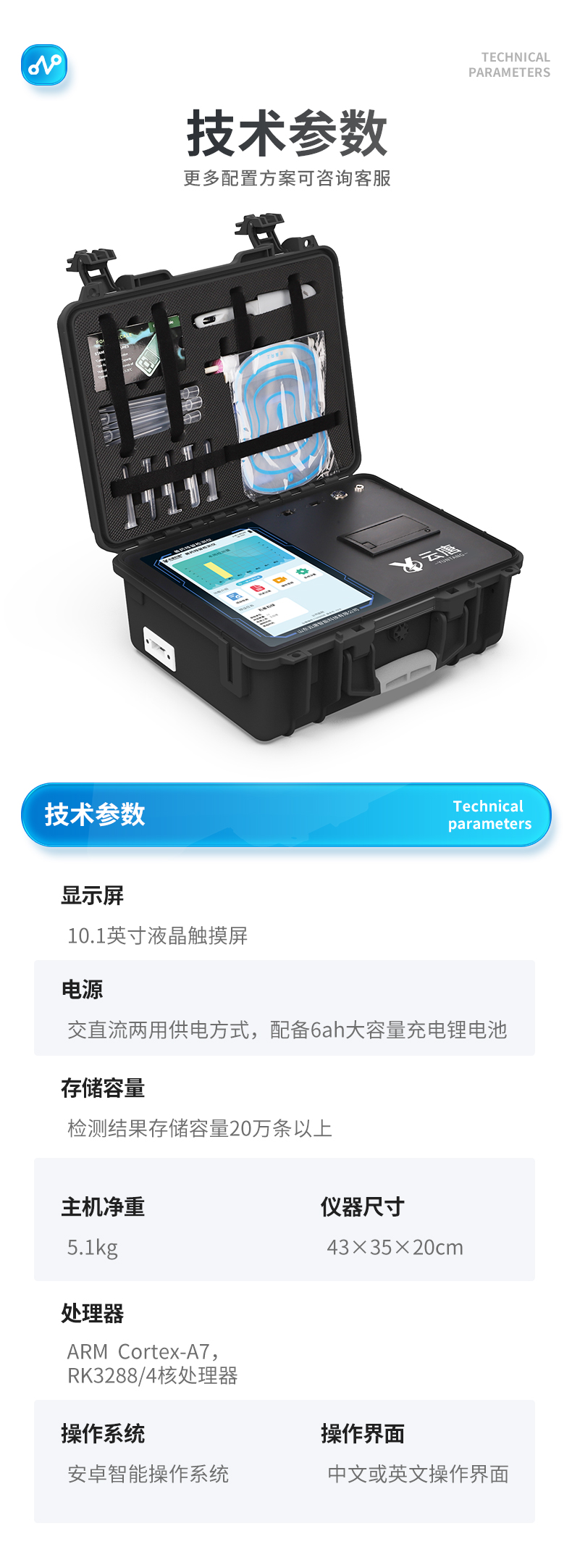 | 1、仪器采用10.1英寸液晶触摸屏显,搭配运行安卓智能操作系统,主控芯片采用ARM Cortex-A7,RK3288/4核处理器,主频1.88Ghz,运转速度更快速,性能更强。 | 2、仪器功能包括:胶体金检测模块、数字化管理模块、无线通讯模块等,可以满足同一软件下实现所有检测项目的检测,并在同一窗口展示检测结果。 | 3、一体化便携式快检设备,采用交直流两用供电方式,可连接车载电源,配备6ah大容量充电锂电池,可以满足现场及流动检测使用的需求。仪器尺寸:43×35×20cm, 主机净重:5.1kg | 4、系统自带数据集成模块,设备首页自动统计检测数据包含:周检测数据、月检测数据,全部检测总数量,均包含检测总数,合格数,不合格数,以及相关柱形分析图,对各项检测数据清晰掌握,无需电脑查询,更加快捷直观。 | 5、仪器具有任务预设模块,可在样品送检前提前预设样品名称、检测指标、送检单位等信息,样品送检时一键调取保存信息,检测更加方便快捷。 | 6、胶体金检测模块: 轨道式自动传输扫描方式,可实时显示金标卡实时图像,系统自动分析并呈现出CT曲线图,CT线自动识别,无需手动调整,完成检测后自动退出检测卡。 结果判定线可修改,对照值标定值可保存,断电不丢失数据。 兼容市场上其他胶体金卡,使用耗材不受限制,极大增强用户使用体验。 | 7、图像调整功能:可根据金标卡读取图像进行多方位调整,使其更精准读取结果。 | 8、仪器检测系统拥有庞大数据库,并且构建了完善的检索、修订功能。食品库涵盖多种样品名称,可按需添加或删除、编辑样品名称;产品数据库以及历史检测记录支持一键检索功能。 | 9、系统打印自定义化,打印格式多样化,产品合格证(****要求),二维码,抽样信息、检测信息,受检信息、复核信息、抽样日期、检测日期等信息结果,可按需求自行设置打印内容。 | 10、A4纸版本报告打印功能:设备拥有两种结果展示方式,可以自动生成A4打印模板和小票打印模板两种样式,可通过WiFi及网线等方式链接外置打印机可进行打印 | 11、仪器具有 wifi 联网上传、RJ45网线连接功能,可以快速上传数据。同步对接监管平台,数据可局域网和互联网数据上传,检测结果直接传至食品安全监管平台。进行区域食品安全监管及大数据分析处理与数据统计,检测区域食品安全长短期动态,达到食品安全问题预估、预警。 | 12、设备支持U盘存储,标准USB接口,免驱动安装。检测结果存储容量20万条以上,可生成Excel表格,进行一键拷贝,并具有登录保护功能,可设置用户名及密码,规范不同人员操作权限,防止非工作人员操作,并且可以进行重新校准、锁定、恢复出厂设置功能。仪器固件可升级,后期检测项目可扩充。 | 13、仪器具备远程升级功能,可定向分客户分仪器更新,开机后自动更新,并可持续性免费更新系统版本,无需像传统产品返厂更新,节省时间及人力成本并避免了物流运输返厂升级导致设备损坏的潜在风险。 |