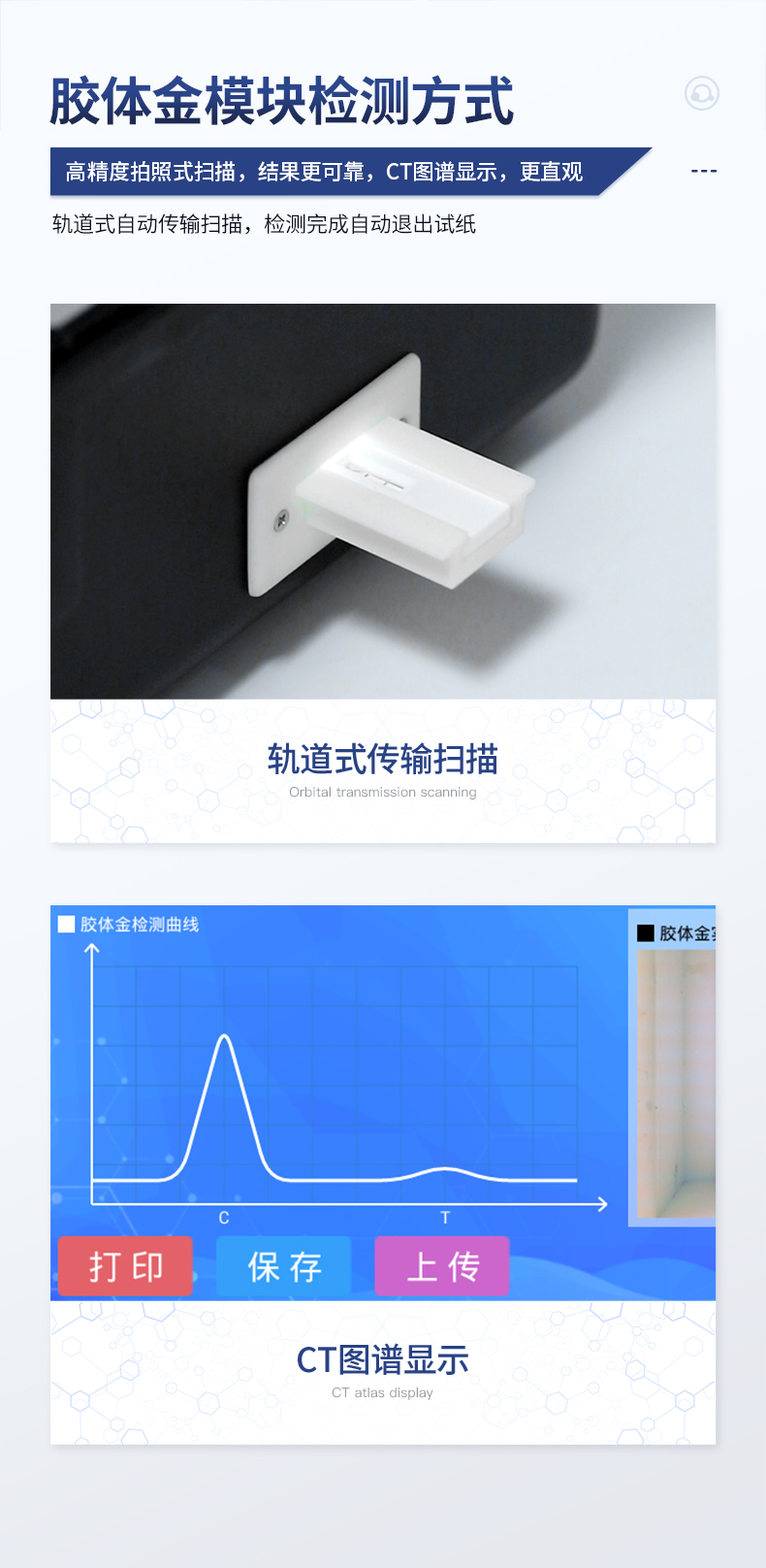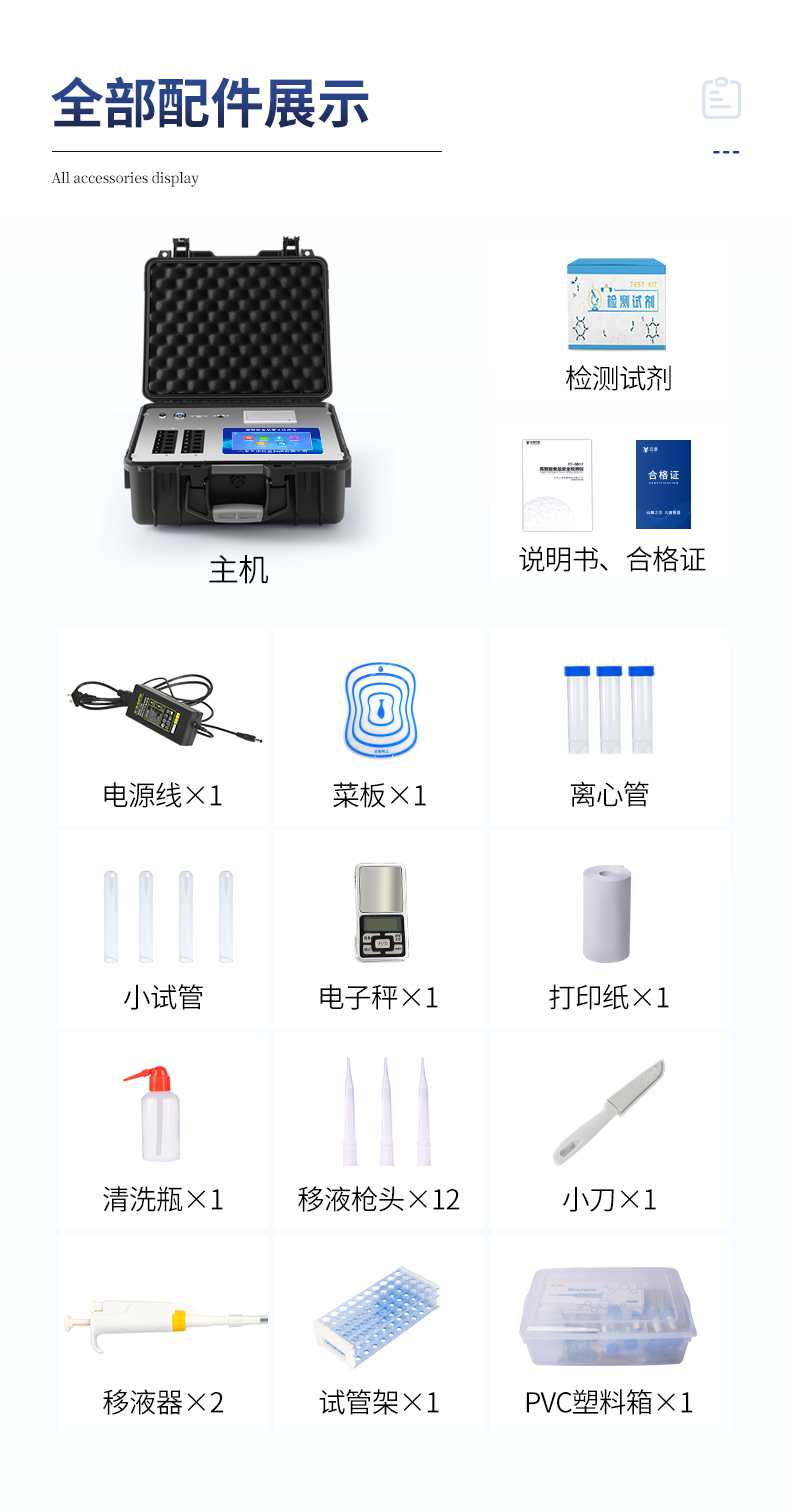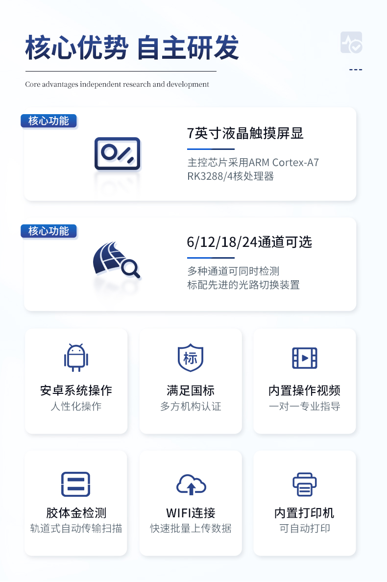 | 1、安卓智能操作系统,采用更加**UI交互界面,仪器具有wifi联网上传、4G联网传输、GPRS无线远传、网线连接功能,快速批量上传数据。 | 2、智能化程度高,仪器具有自检功能:具有开机自检和调零功能,具有自动检测重复性功能。 | 3、新一代高速热敏打印机,检测完成可自动打印或批量打印检测报告和二维码。 | 4、仪器带有监管平台,数据可局域网和互联网数据上传,检测结果直接传至食品安全监管平台。进行区域食品安全监管及大数据分析处理与数据统计,检测区域食品安全长短期动态,达到食品安全问题预估、预警 | 5、一体化主机,包含食品安全检测模块、多通道农药残留检测模块、胶体金免疫层析检测模块。 | 6、一体化便携式快检设备,满足现场及流动检测使用需求,能够在同一软件下实现所有检测项目的检测,并可通过同一窗口直观显示检测结果。 | 7、胶体金模块检测方式:轨道式自动传输扫描,检测完成后自动退出检测卡。 | 8、CT线自动识别,无需手动调整。 | 9、仪器具有多品类多种类样品菜单库,可灵活选择检测样品,不同的检测通道可同时检测不同的样品项目。也可在仪器上直接编辑录入样品名称、检测指标、送检单位等信息并保存进样品数据库。 | 10、仪器内置操作视频,是您身边的化验指导专家。 | 11、样品处理简单省力,整体操作快速、安全、便捷。 | 12、仪器具有自身保护功能,可设置用户名及密码,防止非工作人员操作等。 | 13、高灵敏度,高检测精度,高重复性精度,扫描式高精度光学传感器。 | 14、仪器具有重新校准、锁定、恢复出厂设置功能。 | 15、结果判定线可修改,对照值标定值可保存,断电不丢失数据。 | 16、兼容市场上所有的胶体金卡,使用耗材不受限制,极大增强用户使用体验。 |