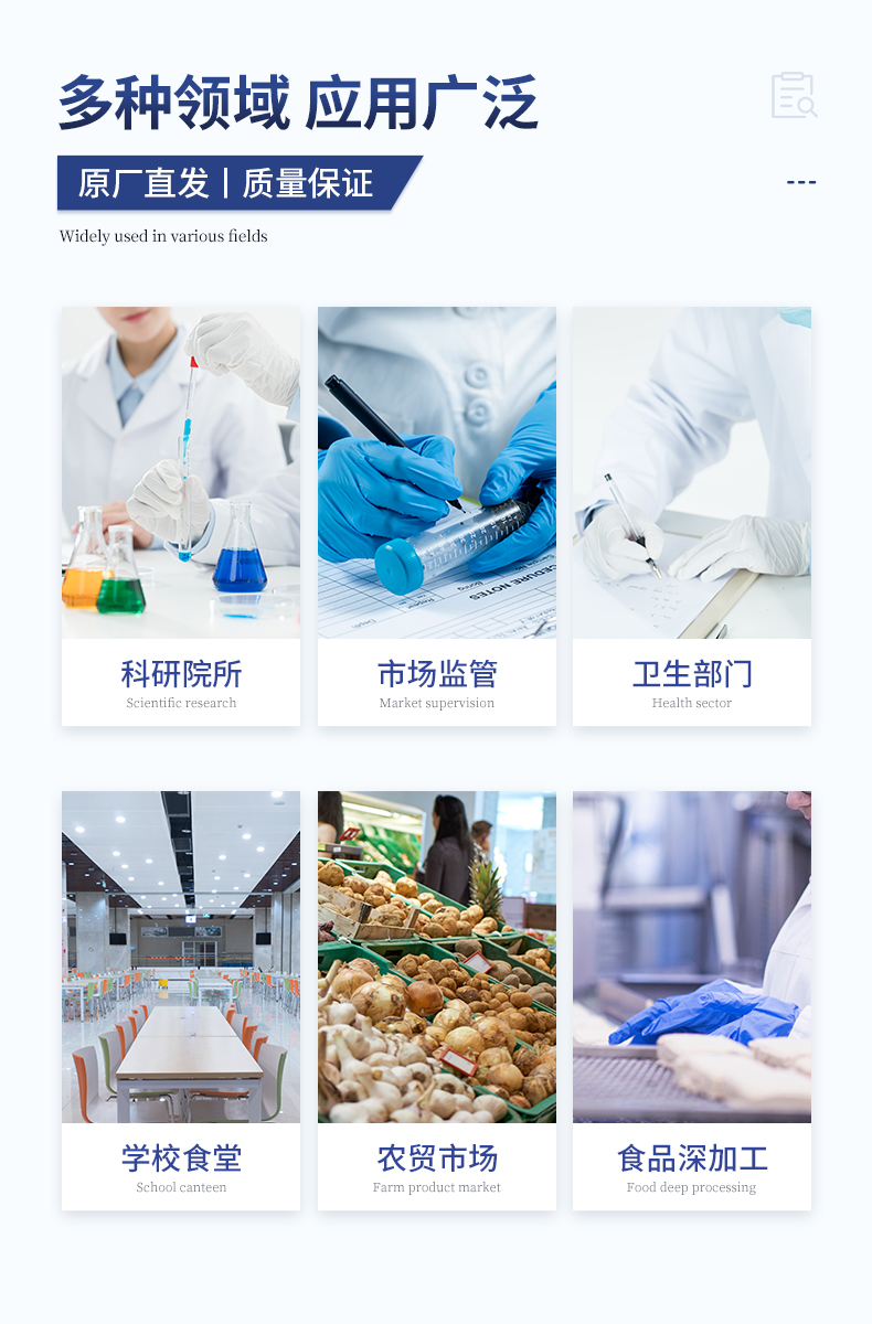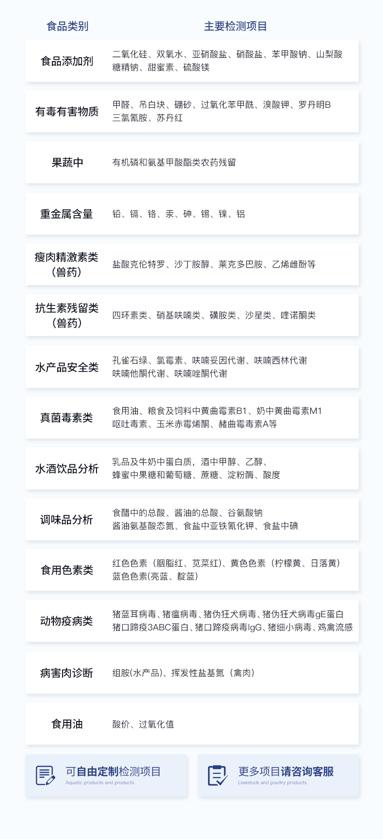 | 各类蔬菜水果中:有机磷和氨基甲酸酯类农药 | 病害肉诊断:组胺、挥发性盐基氮、肉制品酸价、水发产品中组胺等 | 瘦肉精(激素类兽药):盐酸克伦特罗、沙丁胺醇、莱克多巴胺、己烯雌酚、喹乙醇等 | 抗生素(药物残留类兽药):四环素类、硝基呋喃类、磺胺类、沙星类、喹诺酮类、庆大霉素、链霉素、阿莫西林、红霉素等 | 水产品安全类:孔雀石绿、氯霉素、呋喃妥因代谢、呋喃西林代谢、呋喃它酮代谢、呋喃唑酮代谢等 |
