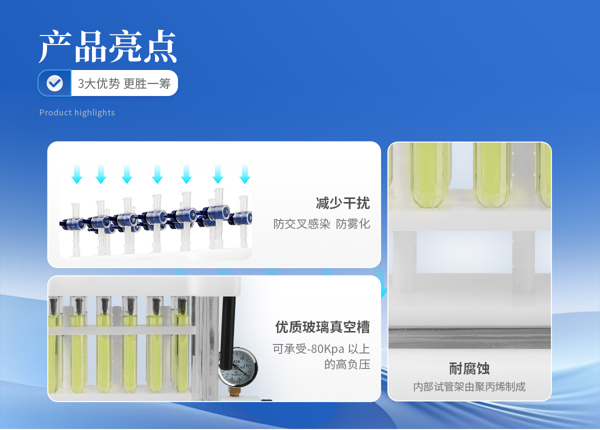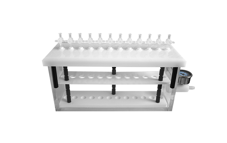 | *固相萃取装置整机由透明有机玻璃制作,耐腐蚀性强。 | *真空槽其壁厚均匀故可承受-0.096Mpa 以上的高负压,长期高压使用不变形。 | *各处受压均匀, 气密性好,稳定性强。 | *萃取速度一致性好、控制调整方便。 | *多通道可独立控制, 接头耐腐蚀。 | *产品内部试管架由聚四氟制成故有耐腐蚀性。 |