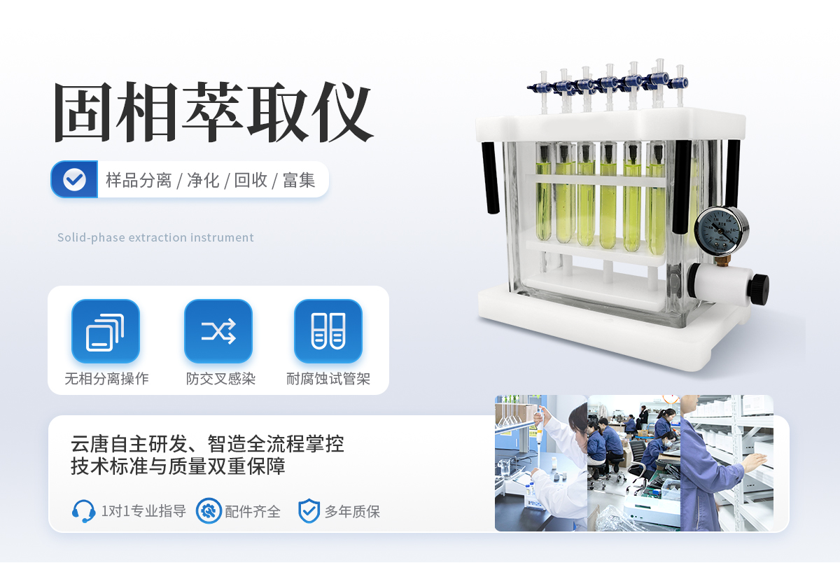 固相萃取仪 (方形)装置是利用固体吸附剂将液体样品中的目标化合物吸附,与样品的基体和干扰化合物分离,然后再用洗脱液洗脱或加热解吸附,达到分离和富集目标化合物的目的(即样品 的分离, 净化和富集), 目的在于降低样品基质干扰, 提高检测灵敏度。