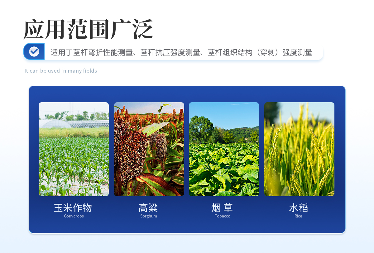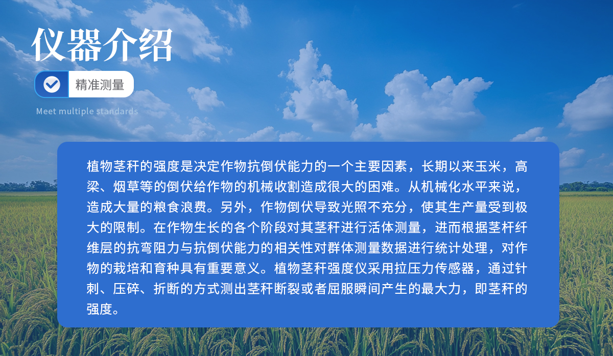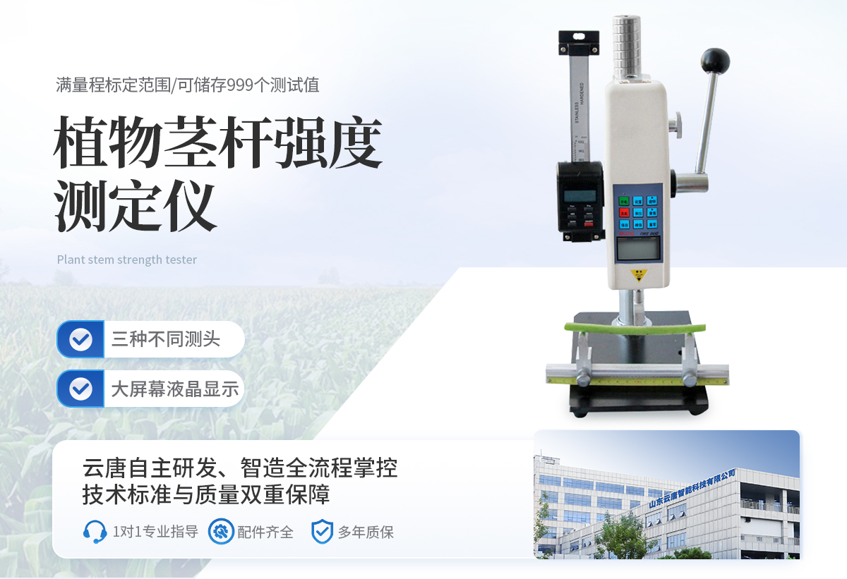 植物茎秆的强度是决定作物抗倒伏能力的一个主要因素,长期以来玉米,高梁、烟草等的倒伏给作物的机械收割造成很大的困难。从机械化水平来说,造成大量的粮食浪费。另外,作物倒伏导致光照不充分,使其生产量受到极大的限制。在作物生长的各个阶段对其茎秆进行活体测量,进而根据茎杆纤维层的抗弯阻力与抗倒伏能力的相关性对群体测量数据进行统计处理,对作物的栽培和育种具有重要意义。植物茎秆强度仪采用拉压力传感器,通过针刺、压碎、折断的方式测出茎秆断裂或者屈服瞬间产生的**力,即茎秆的强度。