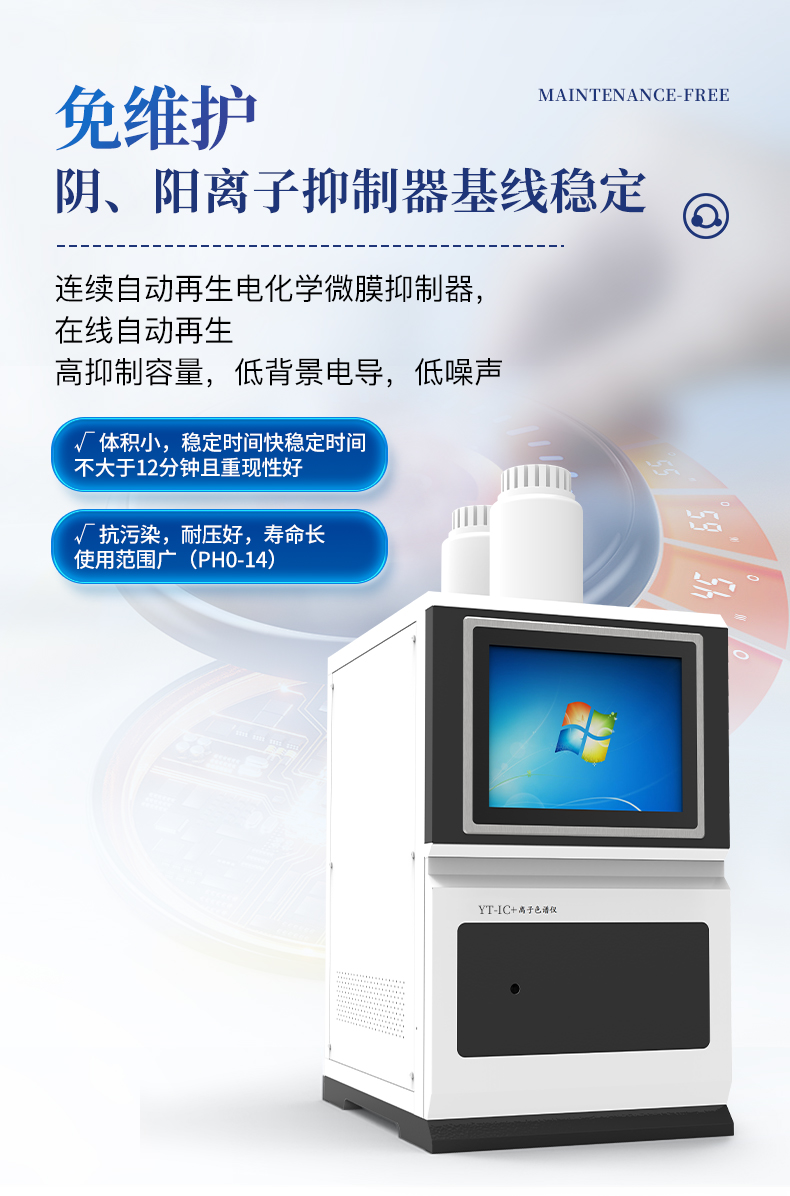 3.1连续自动再生电化学微膜抑制器,在线自动再生,高抑制容量,低背景电导,低噪声,基线稳定,免维护。 3.2抗污染,耐压好,寿命长,使用范围广(PH0-14)。 3.3体积小,稳定时间快,稳定时间不大于12分钟,且重现性好。 |