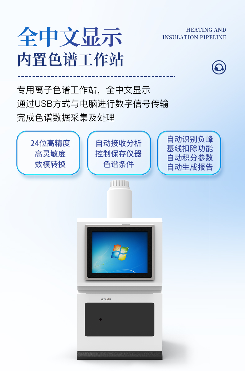 5.1 24位高精度高灵敏度数模转换。 5.2专用离子色谱工作站,全中文显示,通过USB方式与电脑进行数字信号传输,完成色谱数据采集及处理。 5.3自动接收分析和控制保存仪器色谱条件。 5.4自动识别负峰、基线扣除功能。自动积分参数、自动生成报告。 |