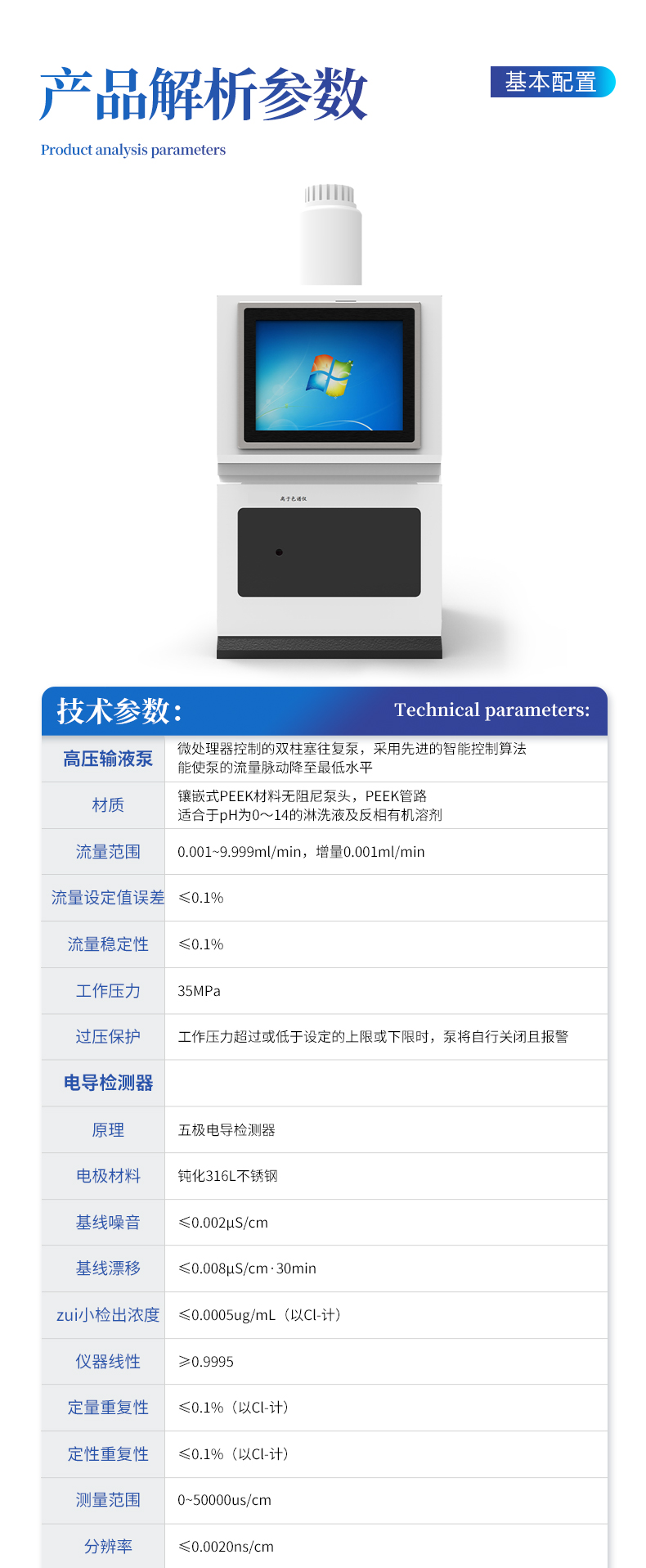 配置国产阴离子分离柱:一次进样分析:氟化物、氯化物、亚硝酸盐、磷酸盐、溴化物、硝酸盐、硫酸盐 配置进口阴离子分离柱:一次进样分析:氟化物、溴酸盐、氯化物、亚硝酸盐、磷酸盐、溴化物、硝酸盐、硫酸盐、亚氯酸盐、高氯酸盐、二氯乙酸、三氯乙酸等 配置进口阳离子分离柱:一次进样分析::Li+、Na+、NH4+、K+、Ca2+、Mg2+、Sr2+、Ba2+等 |