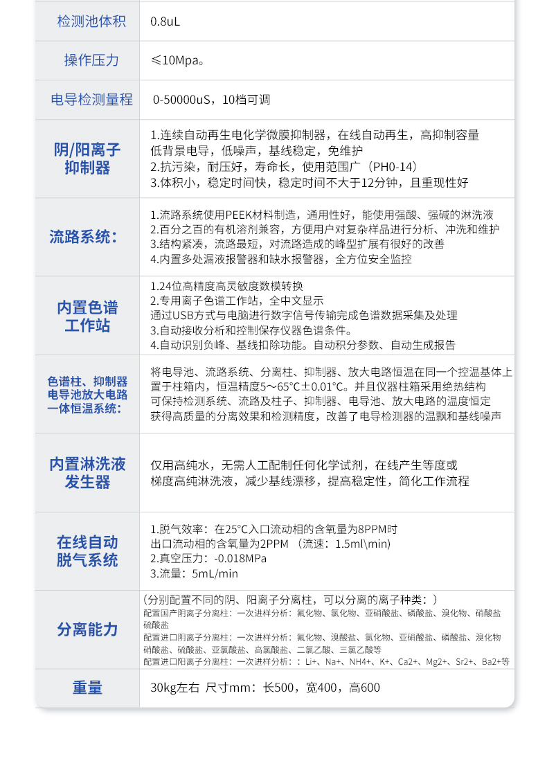 9 分离能力:(分别配置不同的阴、阳离子分离柱,可以分离的离子种类:)