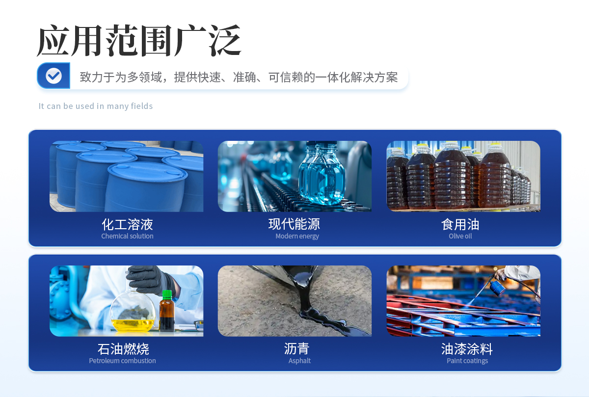 测试种类 化工溶液、化工助剂、现代能源、石油燃烧、药剂、油漆涂料、沥青、食用油等各种液体
