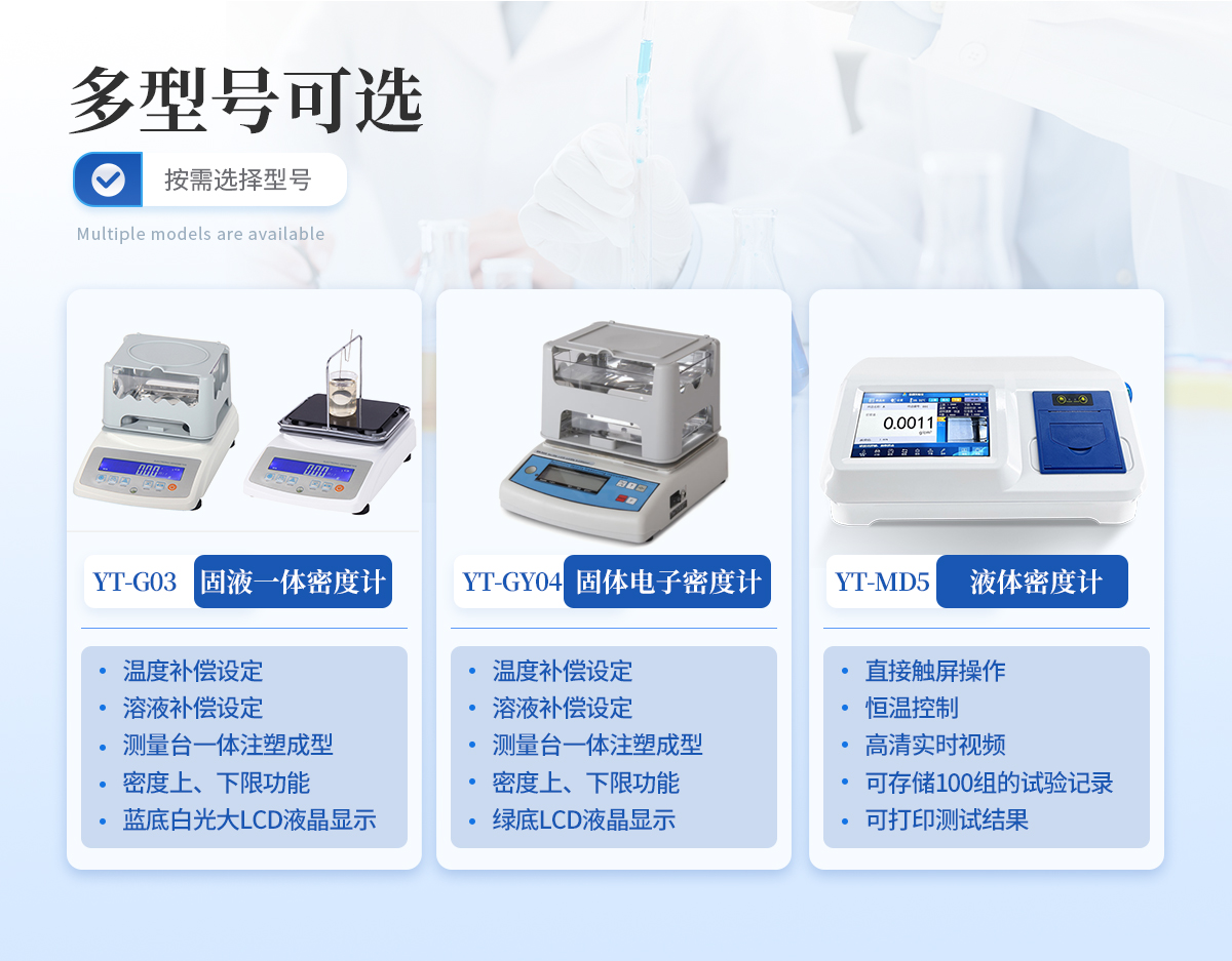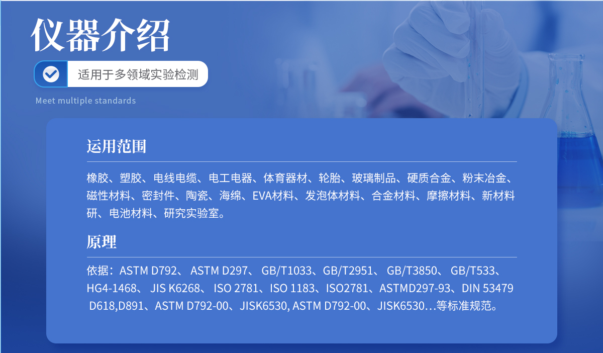 原理:依据:ASTM D792、 ASTM D297、 GB/T1033、GB/T2951、 GB/T3850、 GB/T533、 HG4-1468、 JIS K6268、 ISO 2781、ISO 1183、ISO2781、ASTMD297-93、DIN 53479、D618,D891、ASTM D792-00、JISK6530, ASTM D792-00、JISK6530…等标准规范。