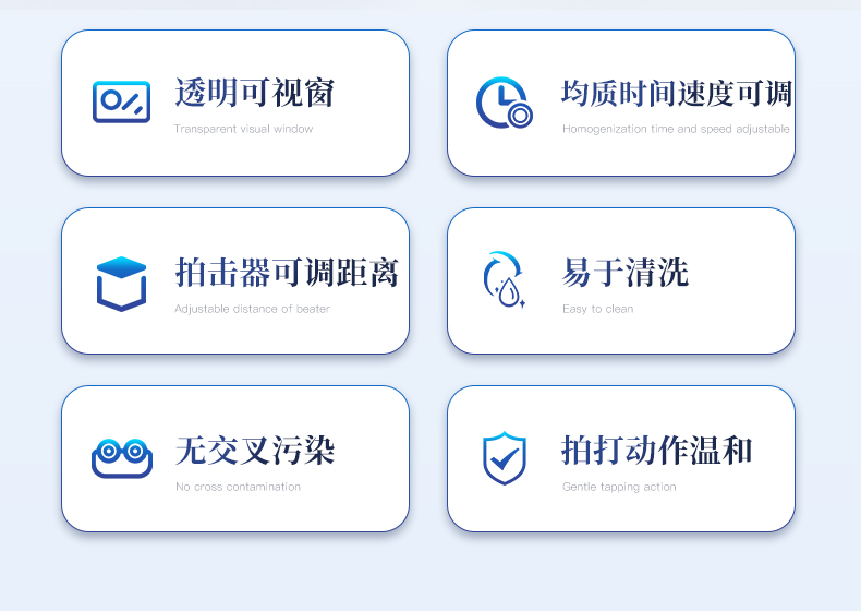 | 1. 拍打动作温和,避免过度破碎,适合微生物检测。 | 2. 使用一次性无菌袋,无交叉污染。 | 3. 均质时间、拍打速度可调。 | 4. 可储存九组工作程序,一键操作。 | 5. 拍击器可调整前后距离。 | 6. 全开启式门,易于清洗。 | 7. 带有透明可视窗,方便观察样品均质效果。 | 8. 开门停机,确保安全。 |