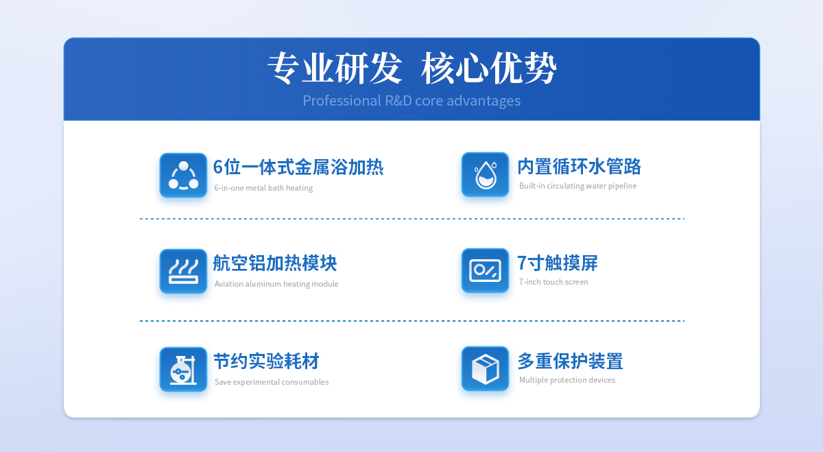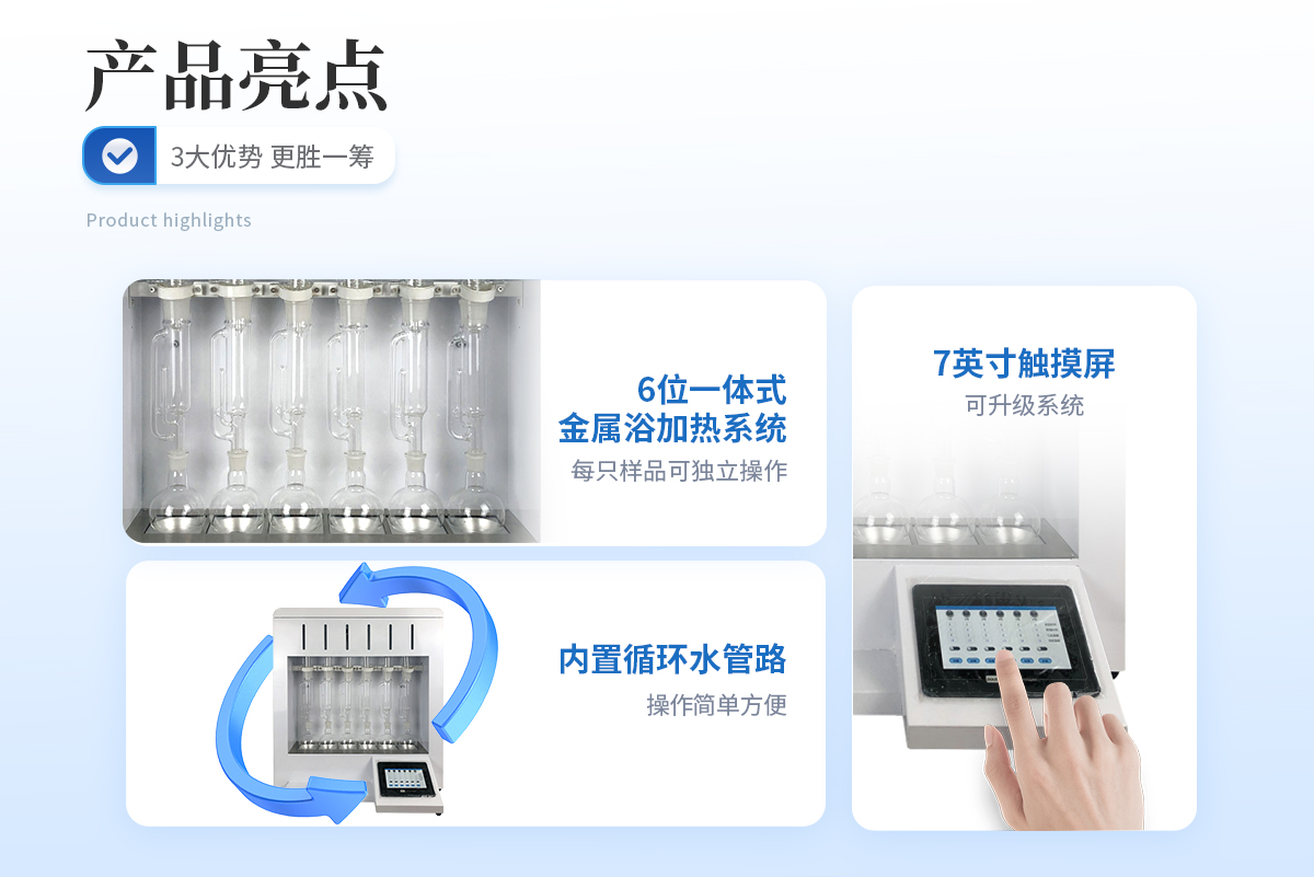 | 1.7英寸大液晶触摸屏显示控制,可升级程序控温和远程操作系统 | 2.6位一体式金属浴加热系统,保证每只样品可独立操作 | 3.航空铝加热模块,升温速度快,回流速度快,大大缩短提取时间 | 4.进口温度传感器,控温精度高,均匀性好 | 5.自带加热萃取、淋洗溶剂回收功能,大大节约实验耗材 | 6.内置循环水管路,操作简单方便(可升级为内置冷却装置) | 7.具有过压,过热,漏电多重保护装置,无需看管,保证机器长时间使用的安全性 | 8.可升级成内置冷水系统,无需外接水源。具有计时和时间控制的循环系统;冷却水全自动控制。 |