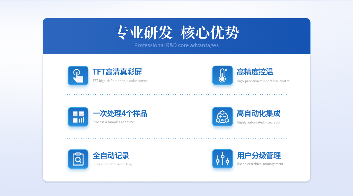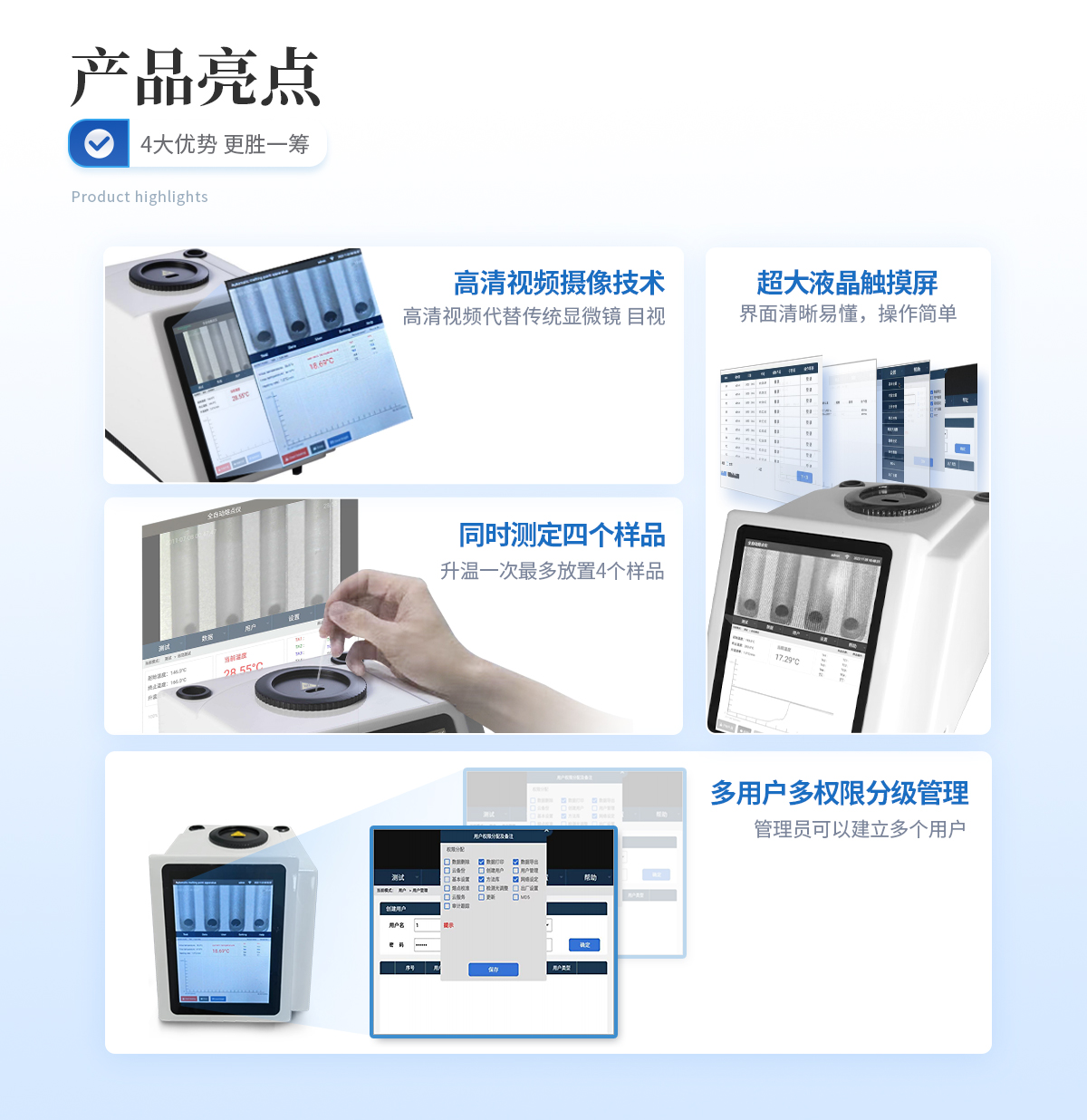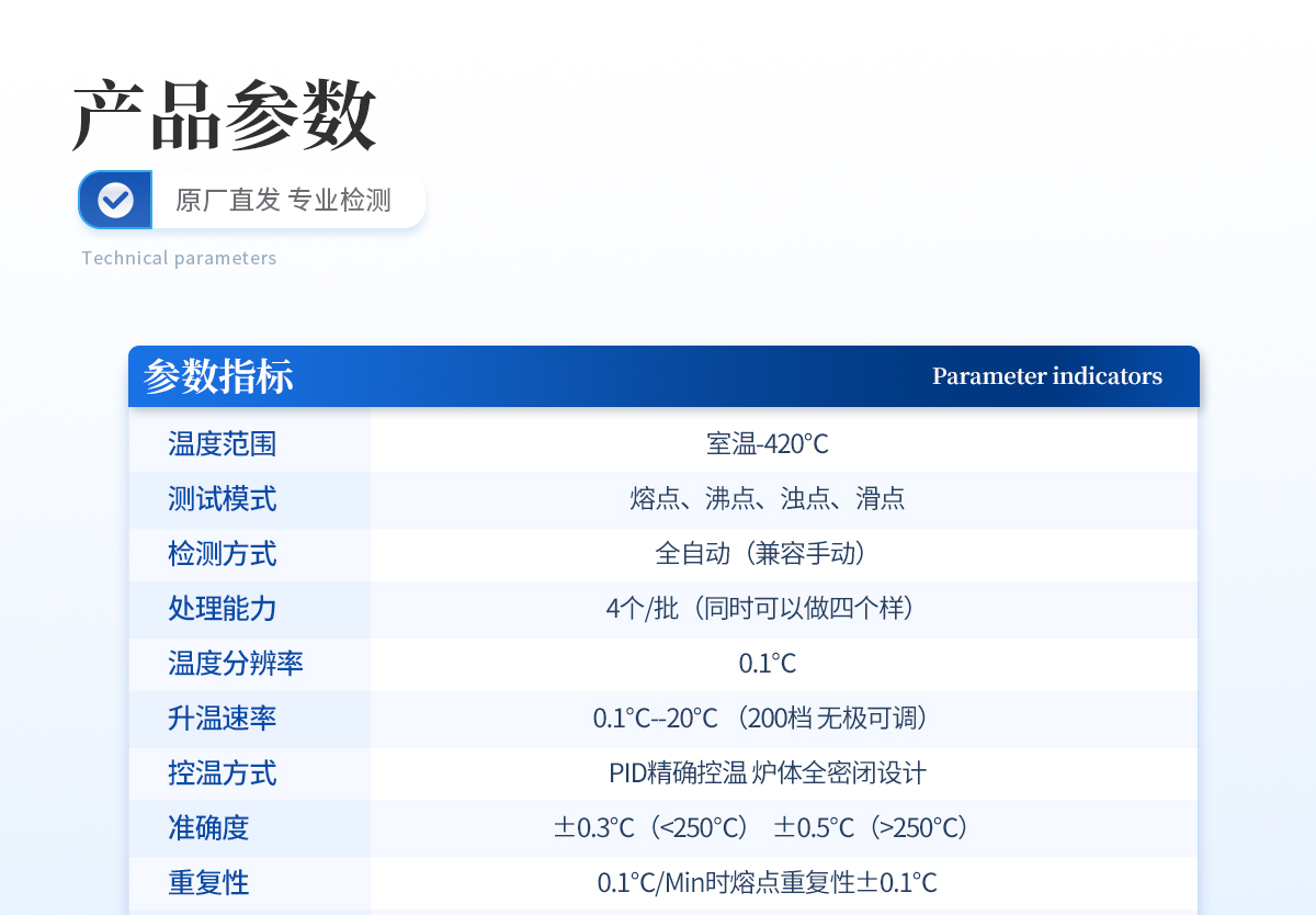 1、自动化集成,实现一键测定功能; | 2、一次处理4个样品; | 3、高清视频代替传统显微镜 目视高; | 4、半自动记录熔程,初熔,终熔; | 5、可通过打印机直接打印数据; | 6、符合21CFR Part 11、审计追踪、药典及电子签名 | 7、符合GLP要求规范; | 8、符合药典2015。 |