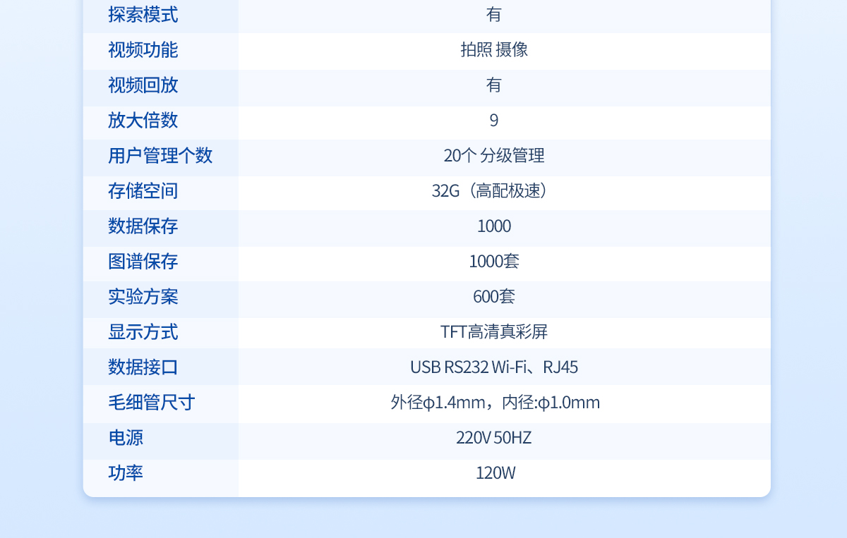 温度范围: 室温-400℃ | 检测方式: 手动 | 处理能力: 4个/批(同时可以做四个样) | 判断能力: 视频目视 | 温度分辨率:0.1℃ | 升温速率: 0.1℃--20℃ (200档 无极可调) | 控温方式: PID**控温 炉体全密闭设计 | 加热方式: 传导液加热法或者电热块空气加热法(选配) | 升温分辨率:0.1℃ | 升温速率: 0.1℃/Min-20℃/Min | 准确度: ±0.2℃(<200℃);±0.4℃(>200℃) | 重复性: 0.1℃/Min时熔点重复性±0.1℃ | 校正功能: 具备 | 探索模式: 有 | 视频回放: 有/有时间水印 | 高清摄像头:观察样品熔融状态 | 放大倍数: ≥10 | 用户管理个数:30个以上 分级三级管理 | 存储空间:32G硬盘,≥2G内存 | 试验方法:有 | 数据保存:有 | 图谱保存:200 | 内存扩展:可以 | 网 络 :无线WIFI | 显示方式:8寸高清彩屏 | 数据接口:USB,网络WiFi接口,RS232 | 数据真实性:防篡改功能 | 数据导出:可用U盘导出 | 数据输出形式:PDF格式和EXCL数据 | 数据溢出提醒:提前自动提醒 | 打印机:选配激光打印机或热敏/针式(兼容) | 毛细管尺寸: 外径φ1.4mm,内径:φ1.0mm | 电源:220V 50HZ 功率:120W |