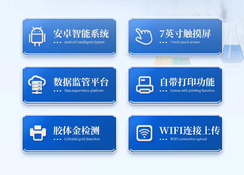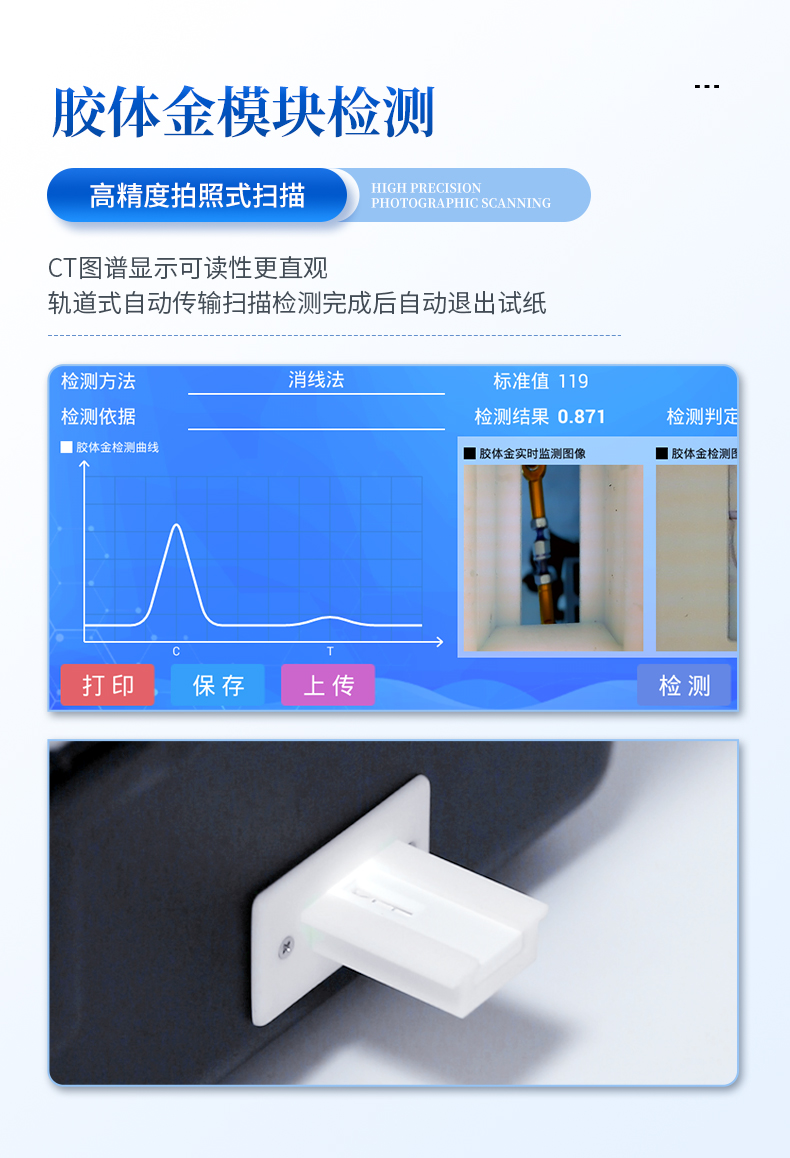 | 安卓智能操作系统,采用更加**和人性化操作,仪器具有wifi联网上传、4G联网传输、GPRS无线远传、网线连接功能,快速上传数据。 | 智能化程度高,仪器具有自检功能:具有开机自检和调零功能,具有自动检测重复性功能。 | 新一代高速热敏打印机,检测完成可自动打印检测报告和二维码。 | 仪器带有监管平台,数据可局域网和互联网数据上传,检测结果直接传至食品安全监管平台。进行区域食品安全监管及大数据分析处理与数据统计,检测区域食品安全长短期动态,达到食品安全问题预估、预警 | 一体化便携式快检设备,满足现场及流动检测使用需求,能够在同一软件下实现所有检测项目的检测,并可通过同一窗口直观显示检测结果。 | 胶体金模块检测方式:轨道式自动传输扫描,检测完成后自动退出检测卡。 | 仪器内置摄像头拍照,可显示金标卡实时图像,系统自动分析并呈现出CT曲线图,CT线自动识别,无需手动调整。 | 仪器具有品类多种类样品菜单库,可灵活选择检测样品,不同的检测通道可同时检测不同的样品项目。 | 样品处理简单省力,整体操作快速、安全、便捷。 | 高灵敏度,高检测精度,高重复性精度,扫描式高精度光学传感器。 | 内置强大的数据库,可在仪器上直接选择样品名称、检测指标、送检单位等信息,也可在仪器上直接编辑录入样品名称、检测指标、送检单位等信息并保存进样品数据库。 | 仪器具有自身保护功能,可设置用户名及密码,防止非工作人员操作等。 | 仪器具有重新校准、锁定、恢复出厂设置功能。 | 结果判定线可修改,对照值标定值可保存,断电不丢失数据。 | 兼容市场上所有的胶体金卡,使用耗材不受限制,极大增强用户使用体验。 |