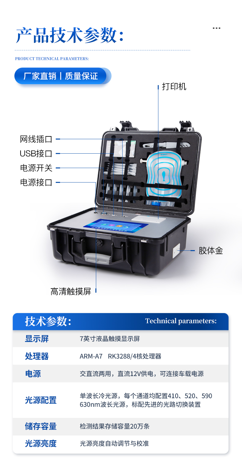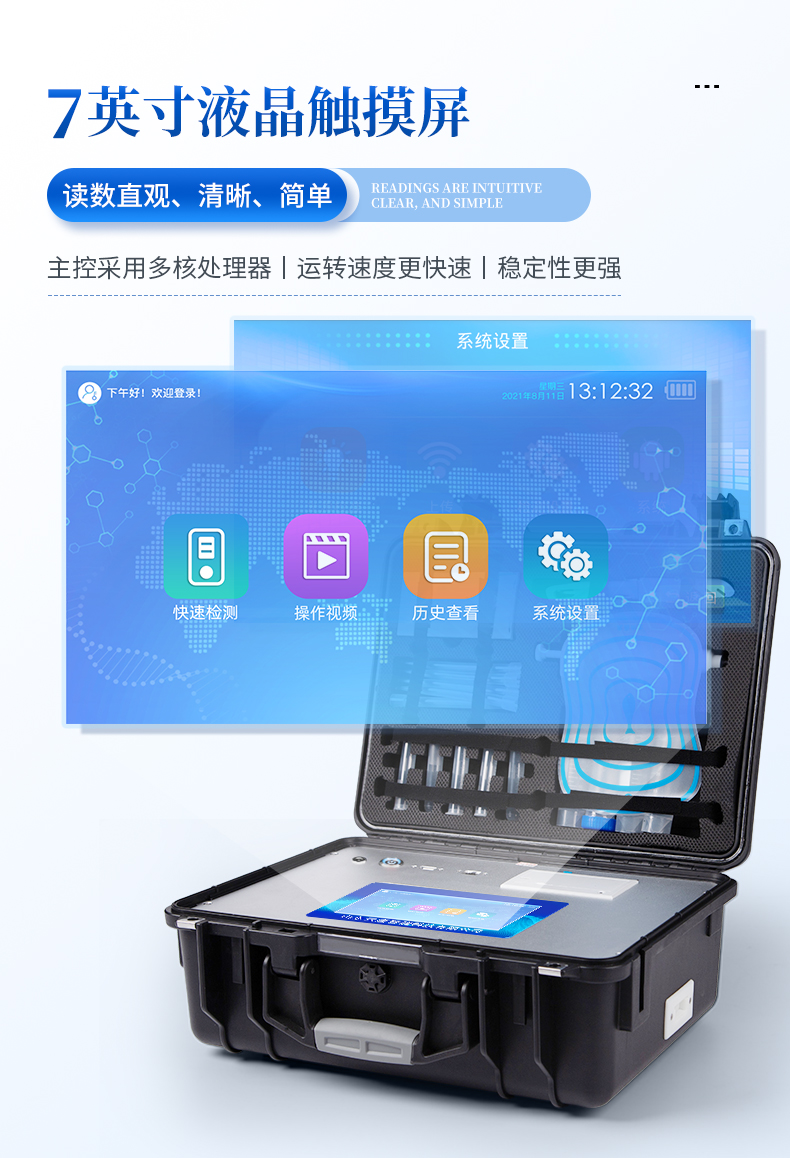 | 主控芯片采用ARM Cortex-A7,RK3288/4核处理器,主频1.88Ghz,运转速度更快速,稳定性更强。 | 显示方式:7英寸液晶触摸屏显示,人性化中文操作界面,读数直观、简单。 | 交直流两用,直流12V供电,可连接车载电源,可配6ah大容量充电锂电池,方便户外流动测试。 | 光源亮度自动调节与校准 | 智能恒流稳压,光强自动校准,长时间连续工作光源无温漂现象。 | 内置新国家限量标准,与所测结果进行现场比对,并持续更新标准。 | 不间断进样,连续检测 | 样本编号自动累加。 | 检测项目可扩充。 | 检测结果可批量打印,批量上传。 | 检测结果为Excel表格,连接电脑即可拷贝。 | 检测结果存储容量20万条 | 支持U盘存储,标准USB接口,免驱动安装。 | 固件可升级。 |