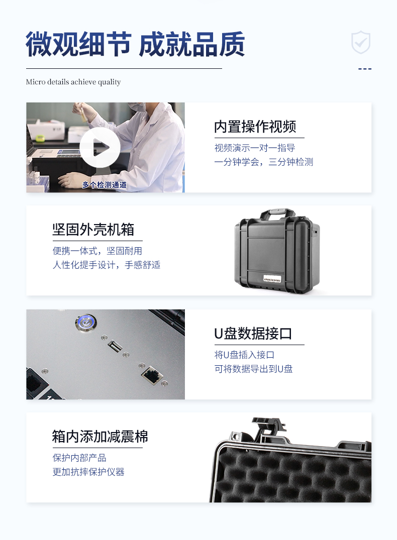 | 安卓智能操作系统,采用更加**的UI交互界面,仪器具有wifi联网上传、4G联网传输、GPRS无线远传、网线连接功能,快速批量上传数据。 | 智能化程度高,仪器具有自检功能:具有开机自检和调零功能,具有自动检测重复功能。 | 新一代高速热敏打印机,检测完成可自动打印和批量打印检测报告和二维码。 | 仪器带有监管平台,数据可局域网和互联网数据上传,检测结果直接传至食品安全监管平台。进行区域食品安全监管及大数据分析处理与数据统计,检测区域食品安全长短期动态,达到食品安全问题预估、预警 | 一体化主机,包含光电比色测模块、胶体金免疫层析检测模块。 | 一体化便携式快检设备,满足现场及流动检测使用需求,能够在同一软件下实现所有检测项目的检测,并可通过同一窗口直观显示检测结果。 | 胶体金模块检测方式:轨道式自动传输扫描,检测完成后自动退出检测卡。 | 食品安全检测仪CT线自动识别,无需手动调整,检测完成自动显示CT坐标曲线。 | 内置强大的数据库,具有多品类多种类样品菜单功能,可灵活选择检测样品,不同的检测通道可同时检测不同的样品项目。也可在仪器上直接编辑录入样品名称、检测指标、检测单位等信息并保存进样品数据库。 | 仪器内置操作演示视频,是您身边的化验指导专家。 | 仪器具有自身保护功能,可设置用户名及密码,防止非工作人员操作等。 | 样品处理简单省力,整体操作快速、安全、便捷。 | 高灵敏度,高检测精度,高重复性精度,扫描式高精度光学传感器。 | 结果判定线可修改,对照值标定值可保存,断电不丢失数据。 | 兼容市场上所有的胶体金卡,使用耗材不受限制,极大增强用户使用体验。 | 仪器具有重新校准、锁定、恢复出厂设置功能。 |