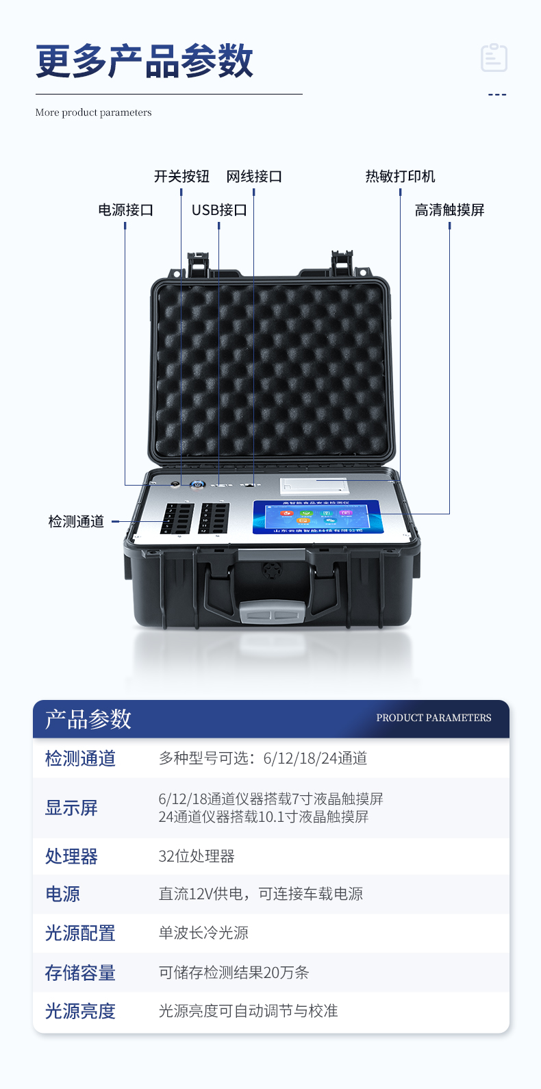| 主控芯片采用ARM Cortex-A7,RK3288/4核处理器,主频1.88Ghz,运转速度更快速,稳定性更强。 | 显示方式:7英寸液晶触摸屏显示,人性化中文操作界面,读数直观、简单。 | 交直流两用,直流12V供电,可连接车载电源,可配6ah大容量充电锂电池,方便户外流动测试。 | 四波长冷光源,12个检测通道,每个通道均配置410、520、590、630nm波长光源,标配**的光路切换装置,专业光路切换功能可实现*多64波长,并且所有检测项目可实现所有通道同时检测。 | 智能恒流稳压,光强自动调节与校准,长时间连续工作光源无温漂现象。 | 内置新国家限量标准,与所测结果进行现场比对,并持续更新标准。 | 不间断进样,连续检测 | 样本编号自动累加 | 数据无线上传平台,并可从平台导出为Excel表格 | 检测结果存储容量20万条 | 同时支持U盘拷贝,标准USB接口,免驱动插拔。 | 检测项目可扩充,固件可升级 | 仪器尺寸:43×35×19cm, 主机净重:5.1kg |