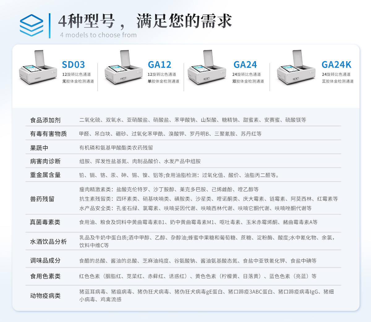 | 仪器采用台式一体化系统检测技术,将分光光度模块、新型农残检测模块、数字化管理模块、无线通讯模块高度集成于一体,支持检测200种食品安全检测项目,同时预留升级检测方法。 | 仪器检测模块标准化、智能化,可随意自由组合。检测箱体内置多个标准检测单元,检测模块可以调整配置。 | 仪器采用全新安卓智能系统,主控芯片采用 ARM Cortex-A7,RK3288/4核处理器,10.1寸高清液晶触摸竖屏,更加**的UI交互界面,运转快捷;仪器配备无线通信模块: 4G(APN)通讯模块、Wifi模块,蓝牙传输,同时具有双USB接口以及RJ45接口能以多种方式实现数据保存和数据传输功能。 | 创新检测模式: | ★检测通道:≥12通道;采用精密旋转比色池设计,使用同芯片同光源校准精度,解决不同光源之间的误差值。1-12通道间误差0.1%。(***:**202022821055.2) | ★仪器具有自动识别比色皿检测功能,即:将样品比色皿放入仪器后,点击样品检测,仪器自动识别比色皿进行通道检测。 | 进口高精光源: | 高精度进口四波长冷光源,通道配置 410、520、590、630nm 波长光源,一个光源芯片驱动一个光源,误差极小,每台设备单独**校准光源,**比对,同时参照四种不同波段光源全方位覆盖市面上99%的农残食品项目检测。 | 智能化操作系统: | 便捷操作系统:设备检测时可在同一检测界面自动对应相关检测通道一次性选择1-12个样品名称,无须退出界面,节省操作时间。 | 数据集成系统:设备首页自动统计检测数据包含:周检测数据、月检测数据,全部检测总数量,均包含检测总数,合格数,不合格数,以及相关柱形分析图,对各项检测数据清晰掌握,无需电脑查询,更加快捷直观。 | 项目预设系统:支持添加单个及多个相同或不相同的任务预设,一键快速调取,每一个任务分别可以设置不同的样品、批次、编号、来源、备注、抽样信息、检测信息、受检信息、复核信息等更多信息。无缝链接平台和APP实时查看下发任务。 | 数据监管系统:同步对接监管平台,数据可局域网和互联网数据上传,检测结果可选择直接传至食品安全监管平台。集成OSS输出存储服务、区分设备定向管理应用,进行区域食品安全监管及大数据分析处理与数据统计,检测区域食品安全长短期动态,达到食品安全问题预估、预警。 | 自定义打印系统:内置全新打印系统,新创自定义打印方式,可按需灵活设置开启或关闭:产品合格证(国家农业部标准要求),二维码,抽样信息、检测信息,受检信息、复核信息、抽样日期、检测日期等信息的打印。 | 系统远程更新功能:可定向分客户分仪器更新系统,按照不同客户后期实际需求添加项目,无需机器返厂,即可远程实时升级全新系统,节省时间成本及避免运输造成设备损坏。 | 仪器主机采用一体化防水、抗压、防撞击、防腐蚀箱体设计,同时配备交直流供电,可连接车载电源,可选配大容量充电锂电池,满足现场野外检测需求。 | 安全证书,放心保障:仪器具有中国计量科学研究院校准证书,权威认证。 |