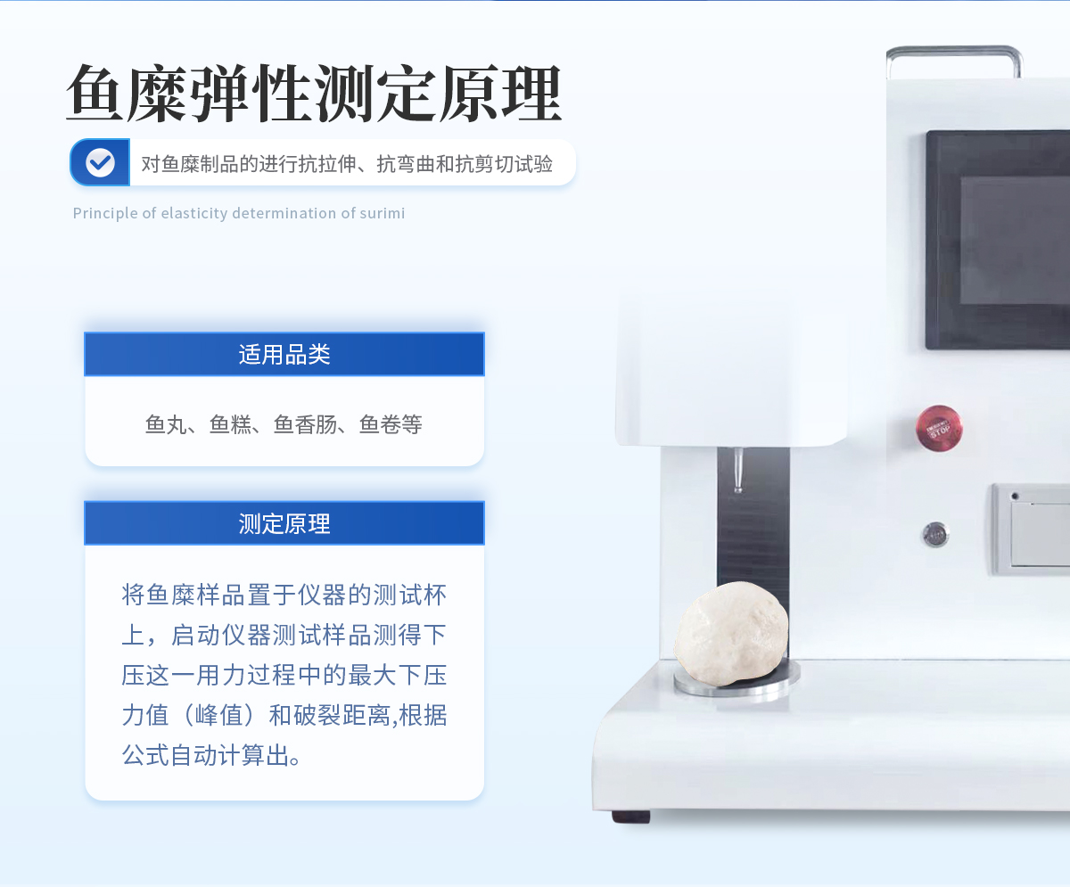 鱼糜系以鱼肉为原料,将鱼肉粉碎,加食盐、副原料等进行擂溃,成粘稠的鱼肉糊再成型后加热,变成具有弹性的凝胶体, 鱼糜弹性对一定形状和尺寸鱼糜制品的进行抗拉伸、抗弯曲和抗剪切试验,衡量鱼糜质量的一项重要指标。