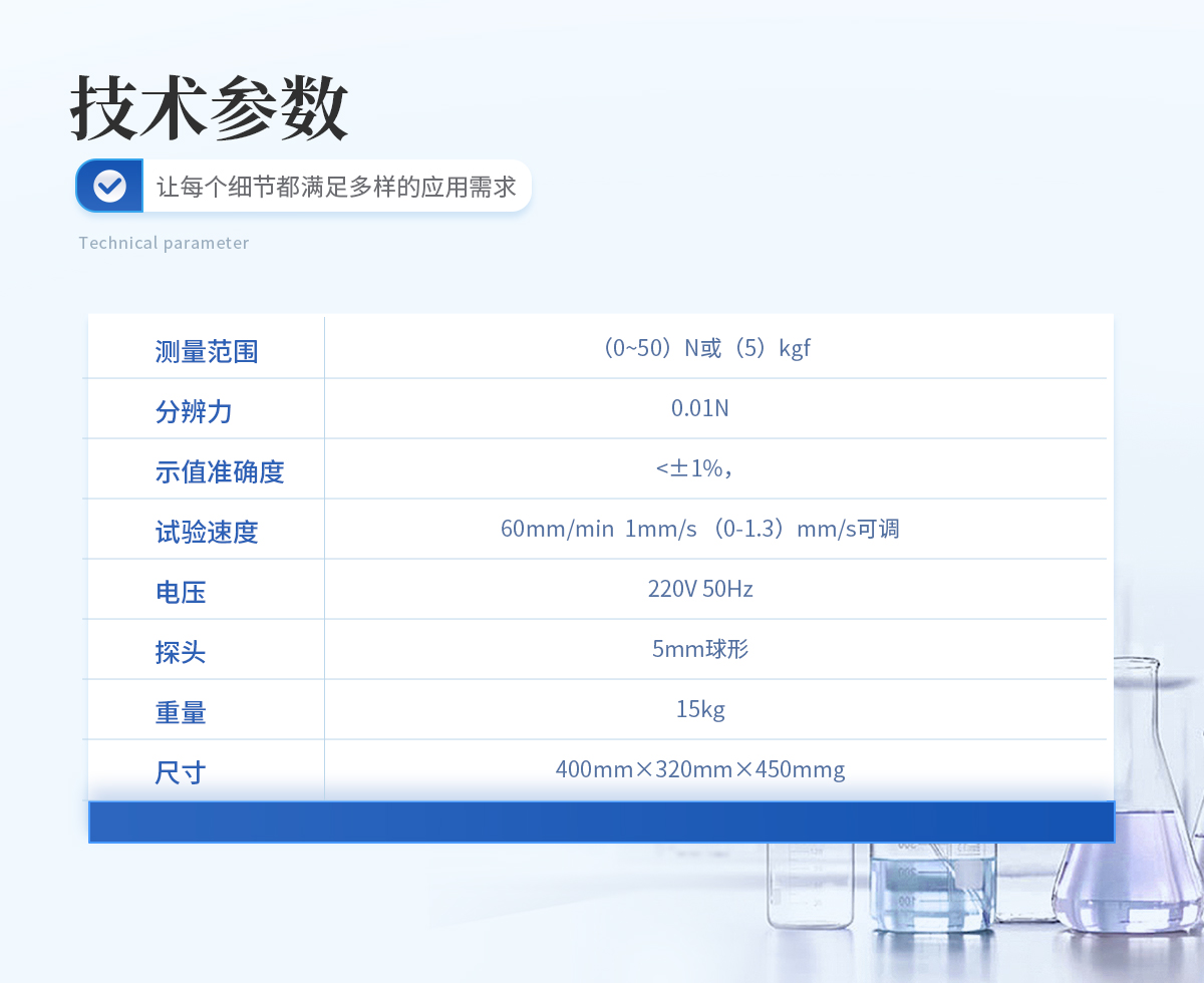| 测量范围:(0~50)N或(5)kgf | 分辨力:0.01N | 示值准确度:<±1%,<> | 试验速度:60mm/min 1mm/s (0-1.3)mm/s可调 | 电压:220V 50Hz | 探头:5mm球形 | 单位:g.cm | 重量:15kg | 尺寸:400mm×320mm×450mm |