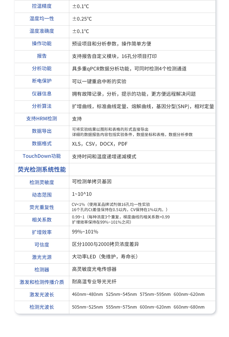 | 基本性能 | 外形尺寸:270*352*195 (mm) | 重量:7.1kg | 电源:220V | 功率:**工作功率300w | 操作系统:自带Android操作系统 | 外接电脑:外接windows电脑(win7系统以上) | 系统语言:中英文实时切换 | 通信接口:方形USB | 操作环境参数 | 操作环境温度:18~35℃ | 操作环境相对湿度:0%~85% | 运输及储存温度:-20~55℃ | 运输及储存相对湿度:0%~85% | 系统性能 | 样品容量:16孔*0.2ml | 样品容积:15~100ul | 适用耗材:0.2ml单管、8×0.2ml排管 | 控温范围:4~99℃ | 热盖温度:30℃-108℃(默认105℃,热盖温度可调) | 温控方式:高性能进口半导体 | 梯度控温:3模块梯度控温,**温差支持35℃ | 升温速率:4.5℃/s(MAX) | 降温速率:3.4℃/s(MAX) | 控温精度:±0.1℃ | 温度均一性:±0.25℃ | 温度准确度:±0.1℃ | 操作功能:预设项目和分析参数,操作简单方便 | 报告:支持报告自定义模块,16孔分项目打印 | 分析功能:具多重qPCR数据分析功能,可同时检测4个检测通道 | 断电保护:可以一键重启中断的实验 | 仪器信息:拥有故障记录,分析,提示的功能,更方便远程解决问题 | 分析算法:扩增曲线,标准曲线定量、熔解曲线,基因分型(SNP),相对定量 | 支持HRM检测:支持 | 数据导出:可将实验结果以图形和表格的形式直接导出;详细的数据报告内容包括实验条件,数据坐标和表格,数据分析参数。 | 数据格式:XLS, CSV, DOCX,PDF | TouchDown功能:支持时间和温度递增递减模式 | 荧光检测系统性能 | 检测灵敏度:可检测单拷贝基因 | 动态范围:1~10^10 | 荧光重复性:CV<1%(使用某品牌试剂做16孔均一性实验,16个孔的Ct差值保持在0.5以内,CV保持在1%以内。) | 相关系数:0.99~1(每种浓度3个重复,梯度曲线的相关系数>0.99,扩增效率保持在99%~101%之间) | 扩增效率:99%~101% | 可信度:区分1000与2000拷贝浓度差异 | 激光光源:大功率LED(免维护,寿命长) | 检测器:高灵敏度光电传感器 | 激发和检测传播介质:耐高温专业导光光纤 | 激发光波长:460nm~480nm , 525nm~545nm, 575nm~595nm ,600nm~620nm | 检测光波长:505nm~525nm , 555nm~575nm , 600nm~620nm , 660nm~680nm |