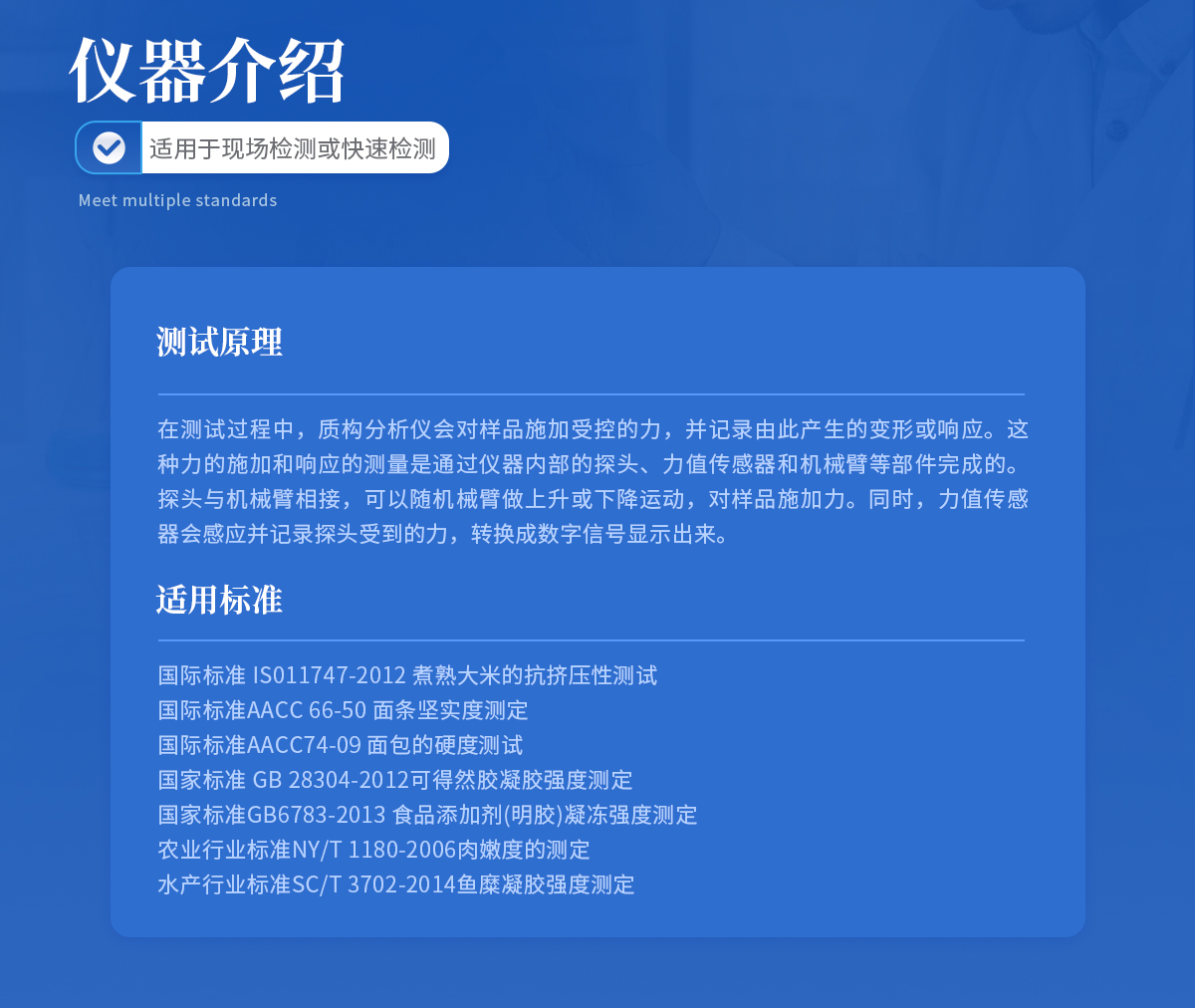 | 国际标准 IS011747-2012 煮熟大米的抗挤压性测试 | 国际标准AACC 66-50 面条坚实度测定 | 国际标准AACC74-09 面包的硬度测试 | **** GB 28304-2012可得然胶凝胶强度测定 | ****GB6783-2013 食品添加剂(明胶)凝冻强度测定 | 农业行业标准NY/T 1180-2006肉嫩度的测定 | 水产行业标准SC/T 3702-2014鱼糜凝胶强度测定 |