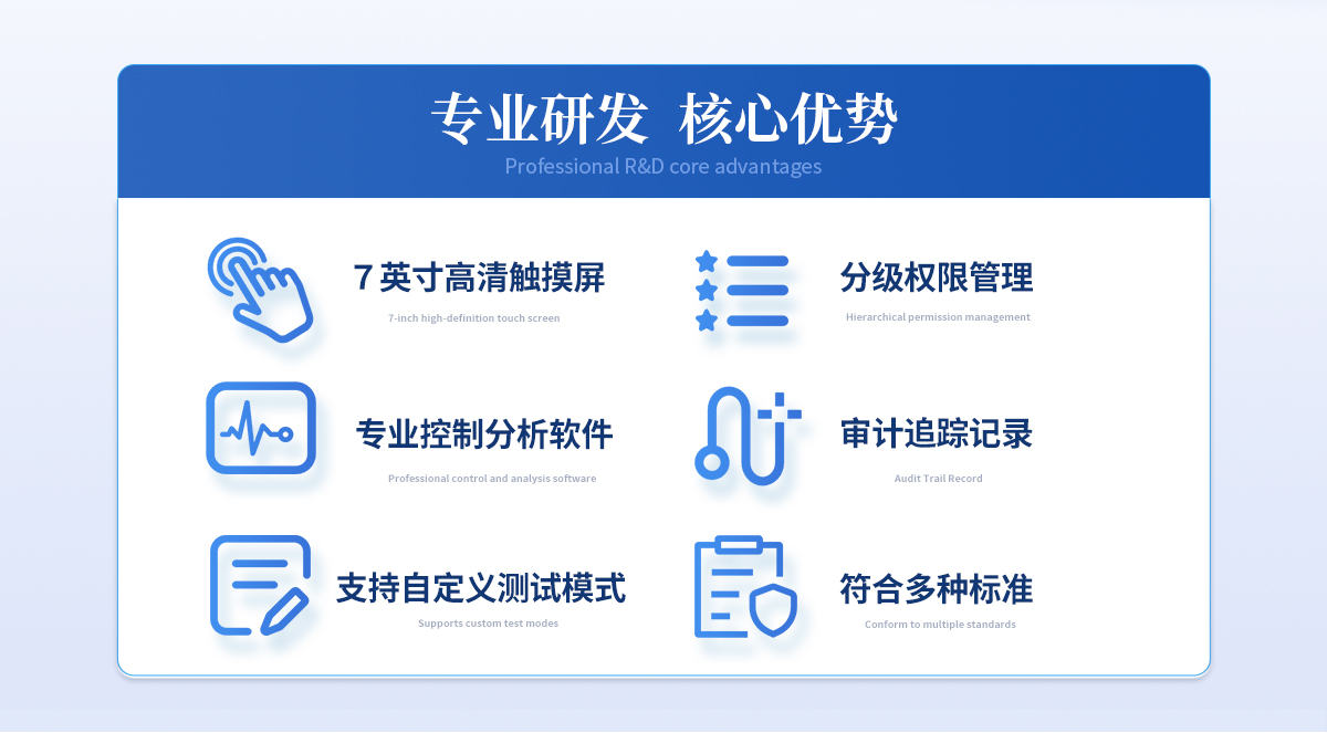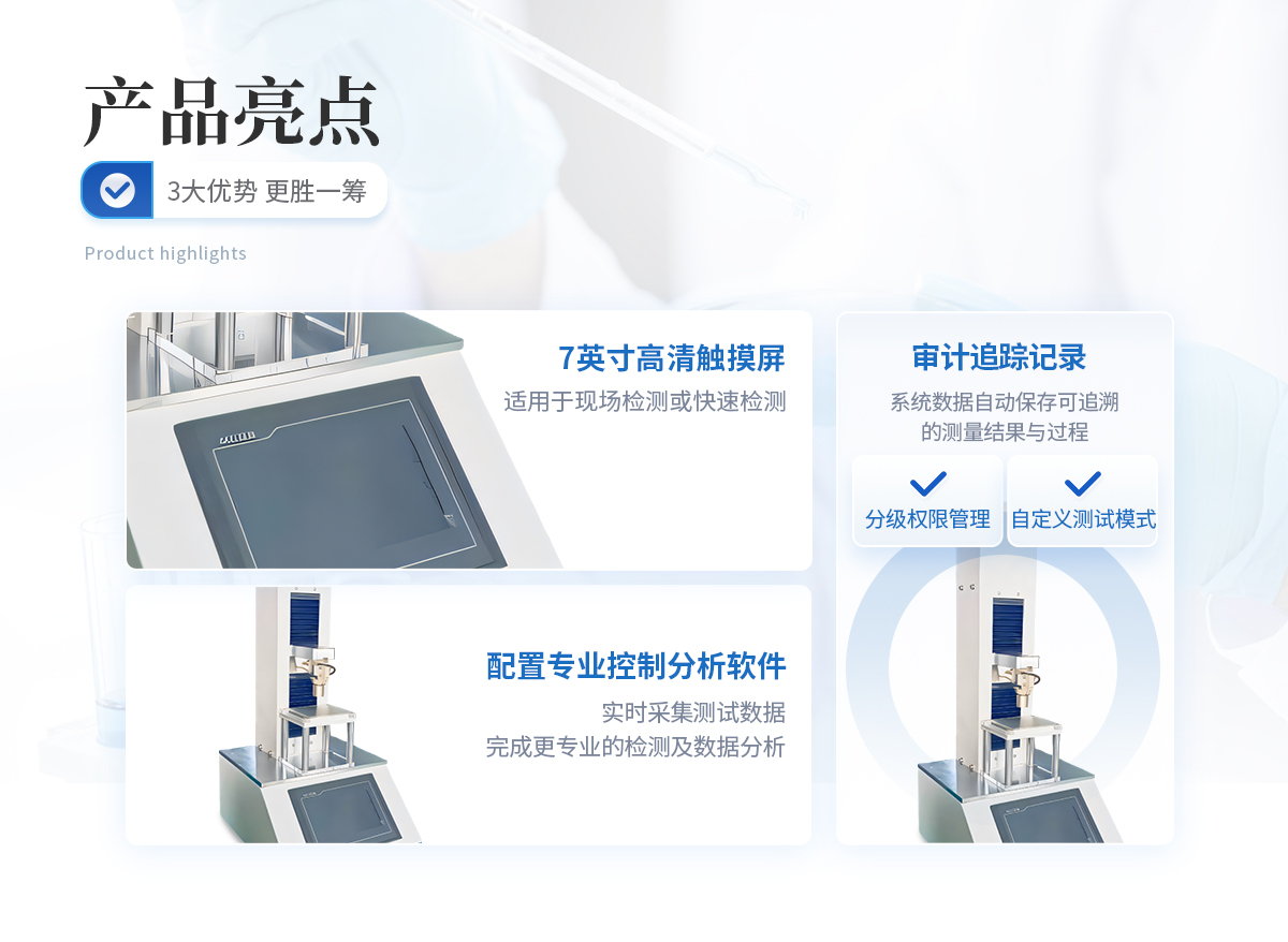 | 操作及控制系统 主机配置7英寸高清触摸屏,可以直接使用触摸屏操作质构分析仪,操作简单,结果显示 直观,适用于现场检测或快速检测。 | 连接计算机使用,配置专业控制分析软件,提供丰富的参数设置,进行更为复杂和精细 的测试控制,实时采集测试数据,完成更专业的检测及数据分析。 | 测试项目及功能 可以应用在食品、制药、乳制品、肉制品、化妆品、凝胶、糖果、果蔬、水鲜、药材、烟草等样品的物性学分析;可以量化获取样品的硬度、脆度、嫩度、粘性、弹性、韧 性、内聚性、咀嚼性、凝冻强度、拉伸强度、破裂强度、剪切强度、抗压强度、穿透强度、蠕变特性、松弛特性等多项物性指标。 | GMP相关要求支持 | 仪器提供分级权限管理:三级别,多用户。(用户名+密码登录) | 仪器科实现审计追踪记录:系统数据自动保存可追溯的测量结果与过程。 | 质构分析仪软件功能 | 测试方法(任选两项): | 单压缩、循环测试、松弛测试、蠕变测试、全质构测试、 拉伸测试、弯曲测试、剪切测试、穿刺测试、凝冻强度测试等。 | 系统开放测试条件参数,支持自定义测试模式。 |