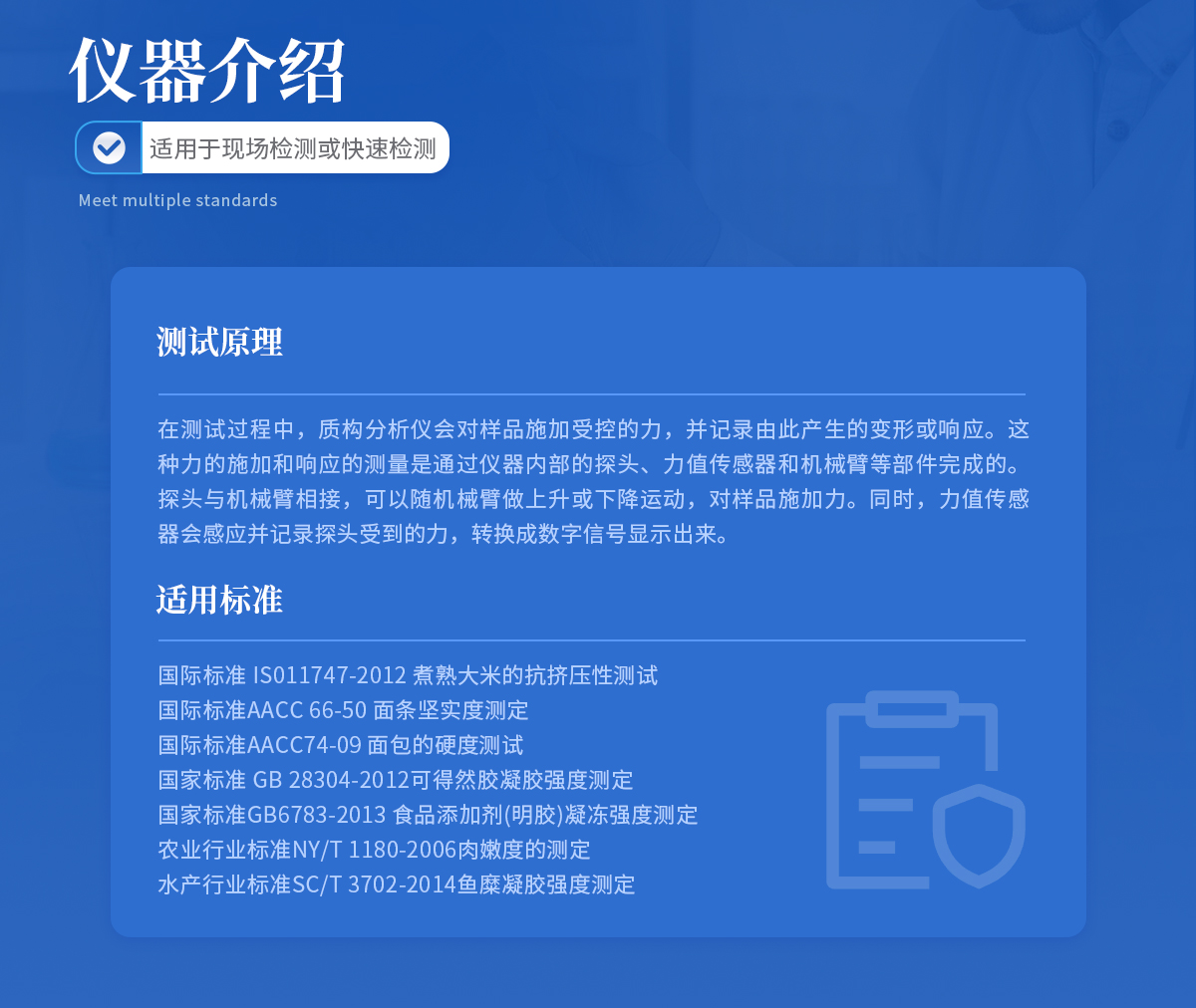 | 国际标准 IS011747-2012 煮熟大米的抗挤压性测试 | 国际标准AACC 66-50 面条坚实度测定 | 国际标准AACC74-09 面包的硬度测试 | **** GB 28304-2012可得然胶凝胶强度测定 | ****GB6783-2013 食品添加剂(明胶)凝冻强度测定 | 农业行业标准NY/T 1180-2006肉嫩度的测定 | 水产行业标准SC/T 3702-2014鱼糜凝胶强度测定 |