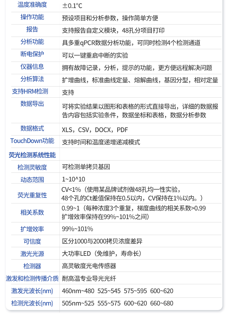 | 基本性能 | 外形尺寸:270*352*195 (mm) | 重量:7.5kg | 电源:220V | 功率:**工作功率550w | 操作系统:自带Android操作系统 | 外接电脑:外接windows电脑(win7系统以上) | 系统语言:中英文实时切换 | 通信接口:方形USB | 操作环境参数 | 操作环境温度:18~35℃ | 操作环境相对湿度:0%~85% | 运输及储存温度:-20~55℃ | 运输及储存相对湿度:0%~85% | 系统性能 | 样品容量:48孔*0.2ml | 样品容积:15~100ul | 适用耗材:0.2ml单管、8×0.2ml排管 | 控温范围:4~99℃ | 热盖温度:30℃-108℃(默认105℃,热盖温度可调) | 温控方式:高性能进口半导体 | 梯度控温:3模块梯度控温,**温差支持35℃ | 升温速率:4.5℃/s(MAX) | 降温速率:3.4℃/s(MAX) | 控温精度:±0.1℃ | 温度均一性:±0.25℃ | 温度准确度:±0.1℃ | 操作功能:预设项目和分析参数,操作简单方便 | 报告:支持报告自定义模块,48孔分项目打印 | 分析功能:具多重qPCR数据分析功能,可同时检测4个检测通道 | 断电保护:可以一键重启中断的实验 | 仪器信息:拥有故障记录,分析,提示的功能,更方便远程解决问题 | 分析算法:扩增曲线,标准曲线定量、熔解曲线,基因分型(SNP),相对定量 | 支持HRM检测:支持 | 数据导出:可将实验结果以图形和表格的形式直接导出;详细的数据报告内容包括实验条件,数据坐标和表格,数据分析参数。 | 数据格式:XLS, CSV, DOCX,PDF | TouchDown功能:支持时间和温度递增递减模式 | 荧光检测系统性能 | 检测灵敏度:可检测单拷贝基因 | 动态范围:1~10^10 | 荧光重复性:CV<1%(使用某品牌试剂做48孔均一性实验,48个孔的Ct差值保持在0.5以内,CV保持在1%以内。) | 相关系数:0.99~1(每种浓度3个重复,梯度曲线的相关系数>0.99,扩增效率保持在99%~101%之间) | 扩增效率:99%~101% | 可信度:区分1000与2000拷贝浓度差异 | 激光光源:大功率LED(免维护,寿命长) | 检测器:高灵敏度光电传感器 | 激发和检测传播介质:耐高温专业导光光纤 | 激发光波长:460nm~480nm , 525nm~545nm, 575nm~595nm ,600nm~620nm | 检测光波长:505nm~525nm , 555nm~575nm , 600nm~620nm , 660nm~680nm |