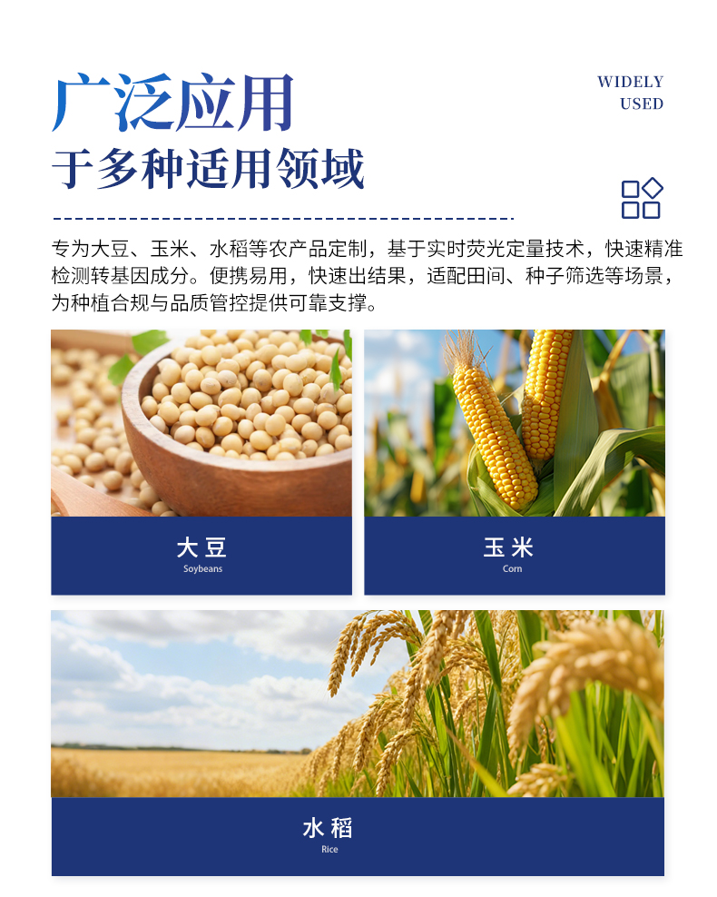 产品简介:本款转基因PCR检测仪专为大豆、玉米、水稻等农产品定制,基于实时荧光定量技术,快速精准检测转基因成分。便携易用,快速出结果,适配田间、种子筛选等场景,为种植合规与品质管控提供···
