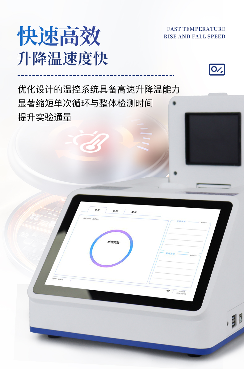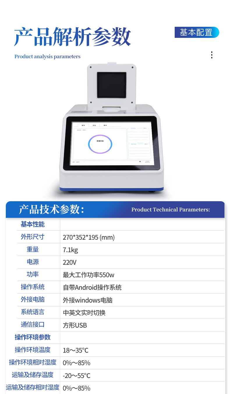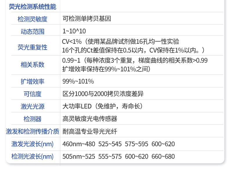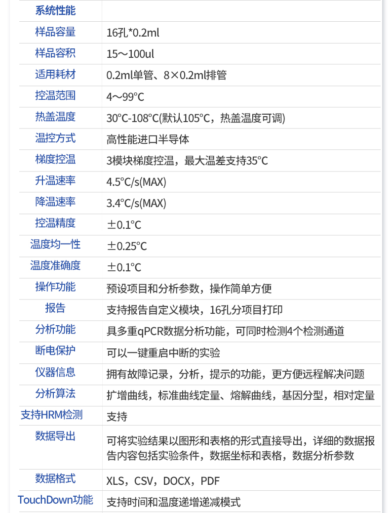 | 基本性能 | 外形尺寸:270*352*195 (mm) | 重量:7.1kg | 电源:220V | 功率:**工作功率300w | 操作系统:自带Android操作系统 | 外接电脑:外接windows电脑(win7系统以上) | 系统语言:中英文实时切换 | 通信接口:方形USB | 操作环境参数 | 操作环境温度:18~35℃ | 操作环境相对湿度:0%~85% | 运输及储存温度:-20~55℃ | 运输及储存相对湿度:0%~85% | 系统性能 | 样品容量:16孔*0.2ml | 样品容积:15~100ul | 适用耗材:0.2ml单管、8×0.2ml排管 | 控温范围:4~99℃ | 热盖温度:30℃-108℃(默认105℃,热盖温度可调) | 温控方式:高性能进口半导体 | 梯度控温:3模块梯度控温,**温差支持35℃ | 升温速率:4.5℃/s(MAX) | 降温速率:3.4℃/s(MAX) | 控温精度:±0.1℃ | 温度均一性:±0.25℃ | 温度准确度:±0.1℃ | 操作功能:预设项目和分析参数,操作简单方便 | 报告:支持报告自定义模块,16孔分项目打印 | 分析功能:具多重qPCR数据分析功能,可同时检测4个检测通道 | 断电保护:可以一键重启中断的实验 | 仪器信息:拥有故障记录,分析,提示的功能,更方便远程解决问题 | 分析算法:扩增曲线,标准曲线定量、熔解曲线,基因分型(SNP),相对定量 | 支持HRM检测:支持 | 数据导出:可将实验结果以图形和表格的形式直接导出;详细的数据报告内容包括实验条件,数据坐标和表格,数据分析参数。 | 数据格式:XLS, CSV, DOCX,PDF | TouchDown功能:支持时间和温度递增递减模式 | 荧光检测系统性能 | 检测灵敏度:可检测单拷贝基因 | 动态范围:1~10^10 | 荧光重复性:CV<1%(使用某品牌试剂做16孔均一性实验,16个孔的ct差值保持在0.5以内,cv保持在1%以内。)> | 相关系数:0.99~1(每种浓度3个重复,梯度曲线的相关系数>0.99,扩增效率保持在99%~101%之间) | 扩增效率:99%~101% | 可信度:区分1000与2000拷贝浓度差异 | 激光光源:大功率LED(免维护,寿命长) | 检测器:高灵敏度光电传感器 | 激发和检测传播介质:耐高温专业导光光纤 | 激发光波长:460nm~480nm , 525nm~545nm, 575nm~595nm ,600nm~620nm | 检测光波长:505nm~525nm , 555nm~575nm , 600nm~620nm , 660nm~680nm |